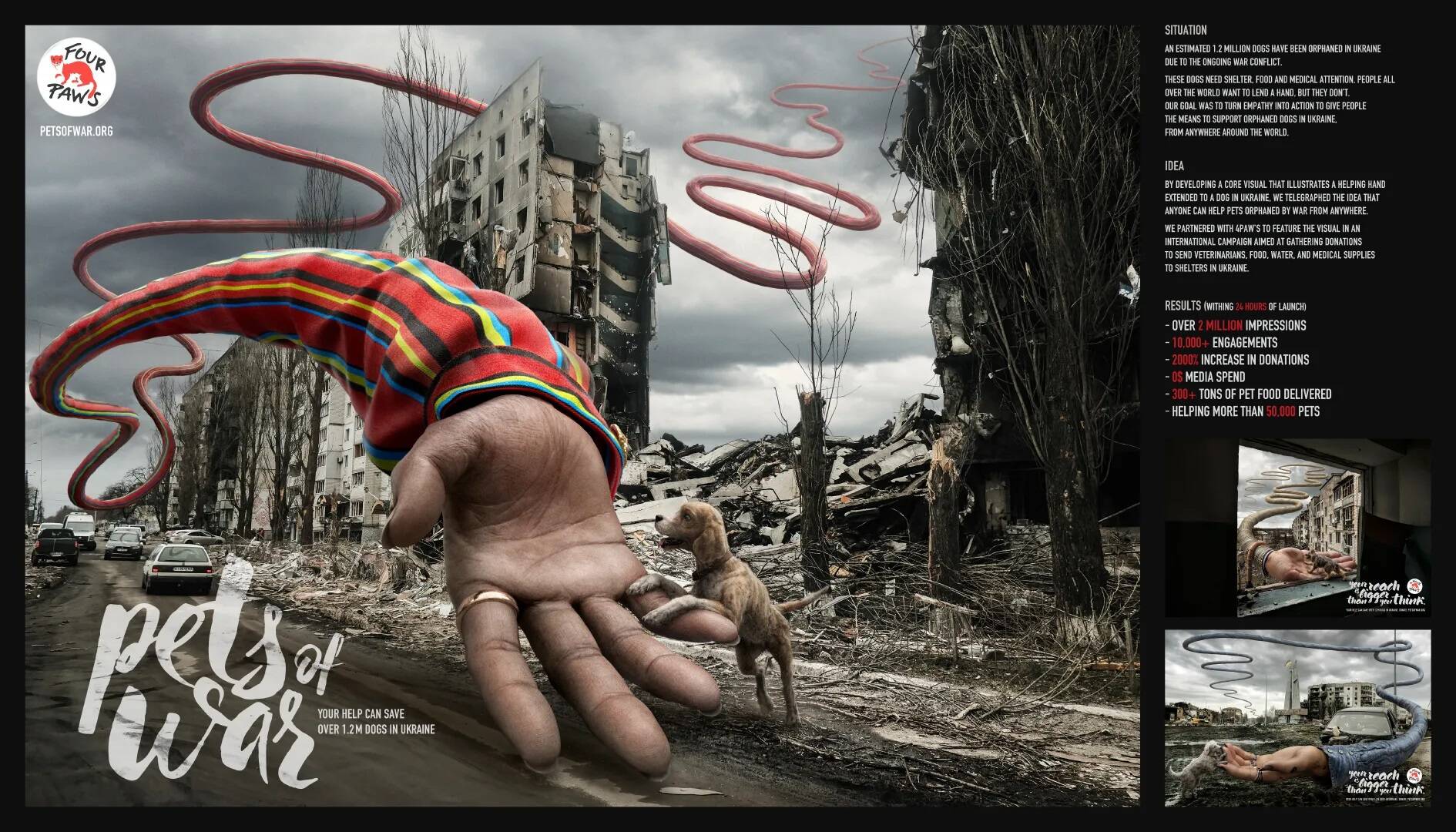 This professional campaign titled 'Pets of War' was published in United States in January, 2024. It was created for the brand: Four Paws, by ad agency: Ogilvy Health NA. This Integrated medium campaign is related to the Pets industry and contains 5 media assets. It was submitted almost 2 years ago.