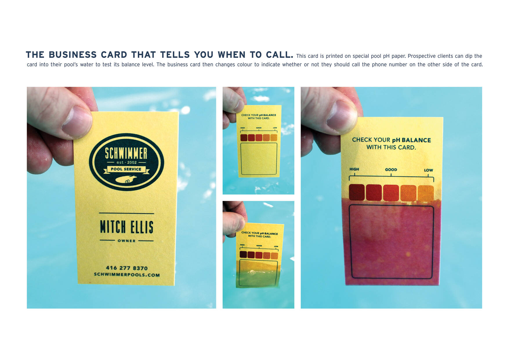 This professional campaign titled 'pH Business Card' was published in Canada in September, 2012. It was created for the brand: Schwimmer Pool Service, by ad agency: Doug & Serge. This Static Images medium campaign is related to the Professional Services industry and contains 1 media asset. It was submitted almost 13 years ago.