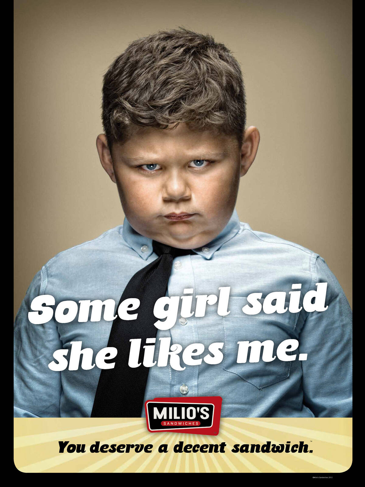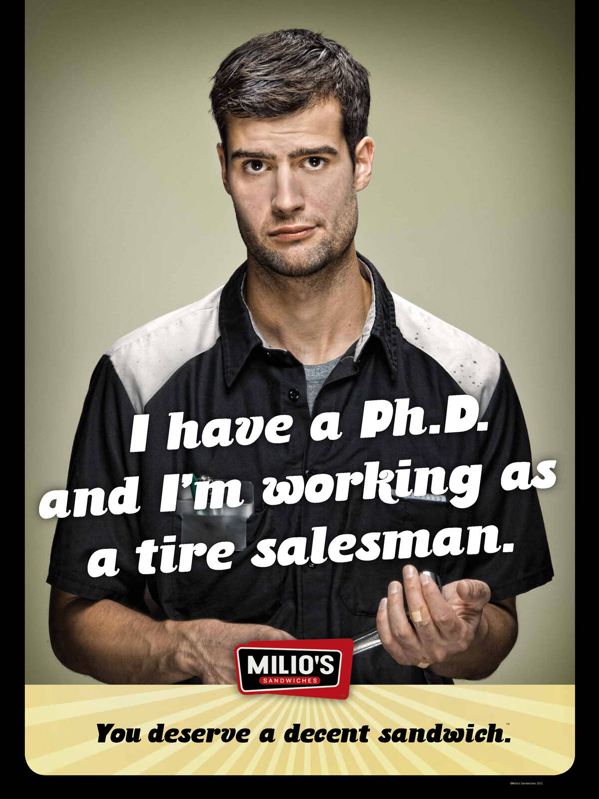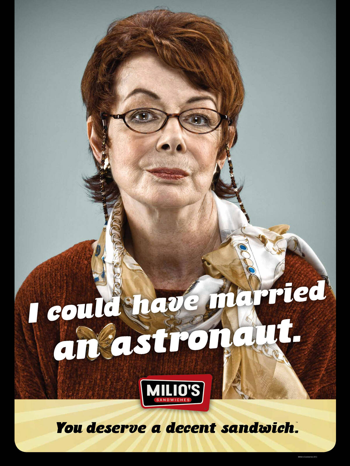 This professional campaign titled 'Phd, Likes me, Hugger, Frisk, Ex-wife, Astronaut, Algebra' was published in United States in September, 2012. It was created for the brand: Milio's Sandwiches, by ad agency: Lindsay Stone & Briggs. This Print medium campaign is related to the Food industry and contains 7 media assets. It was submitted about 13 years ago.
