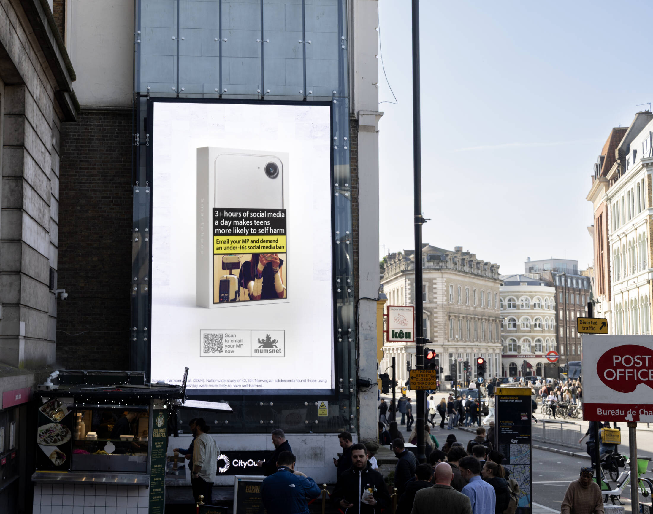 The billboard and social media campaign combines provocative imagery with stark statistics highlighting the serious consequences of phone addiction, from increased rates of self-harm and suicidal ideation to depression and anxiety.