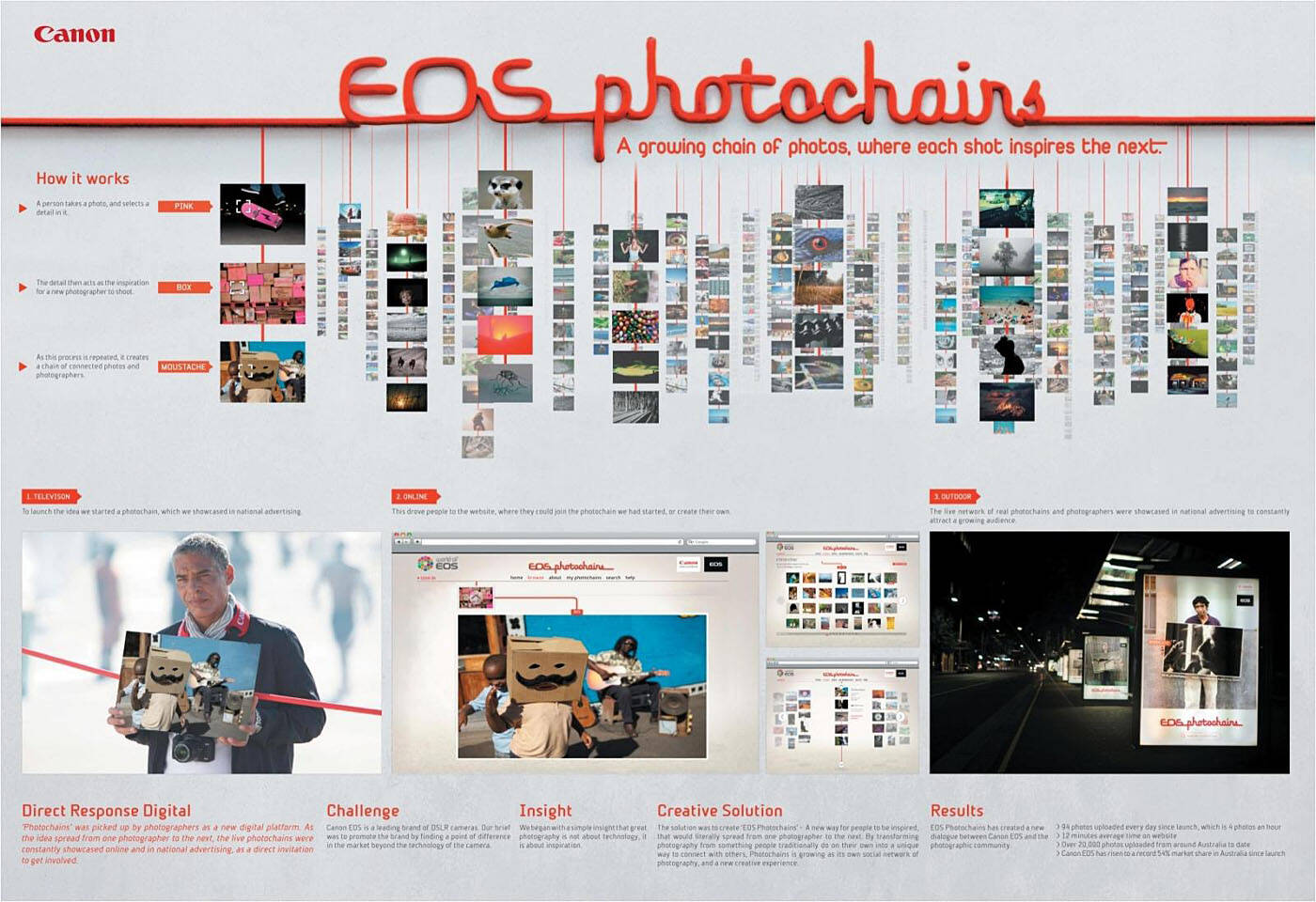 Creative Solution: Our solution was ‘EOS Photochains’ – A new way for people to be inspired, that would literally spread from one photographer to the next as a new creative experience. By transforming photography from something people traditionally do on their own into a unique way to connect with others, Photochains is growing as its own social network of photography, and a new creative experience. Our desired outcome was to create an idea that photographers would embrace in their everyday lives, grew a new community of photography online, and was inextricably linked with the Canon EOS brand. Photochains was created by integrating the advertising, live photochains network and photographers as one.