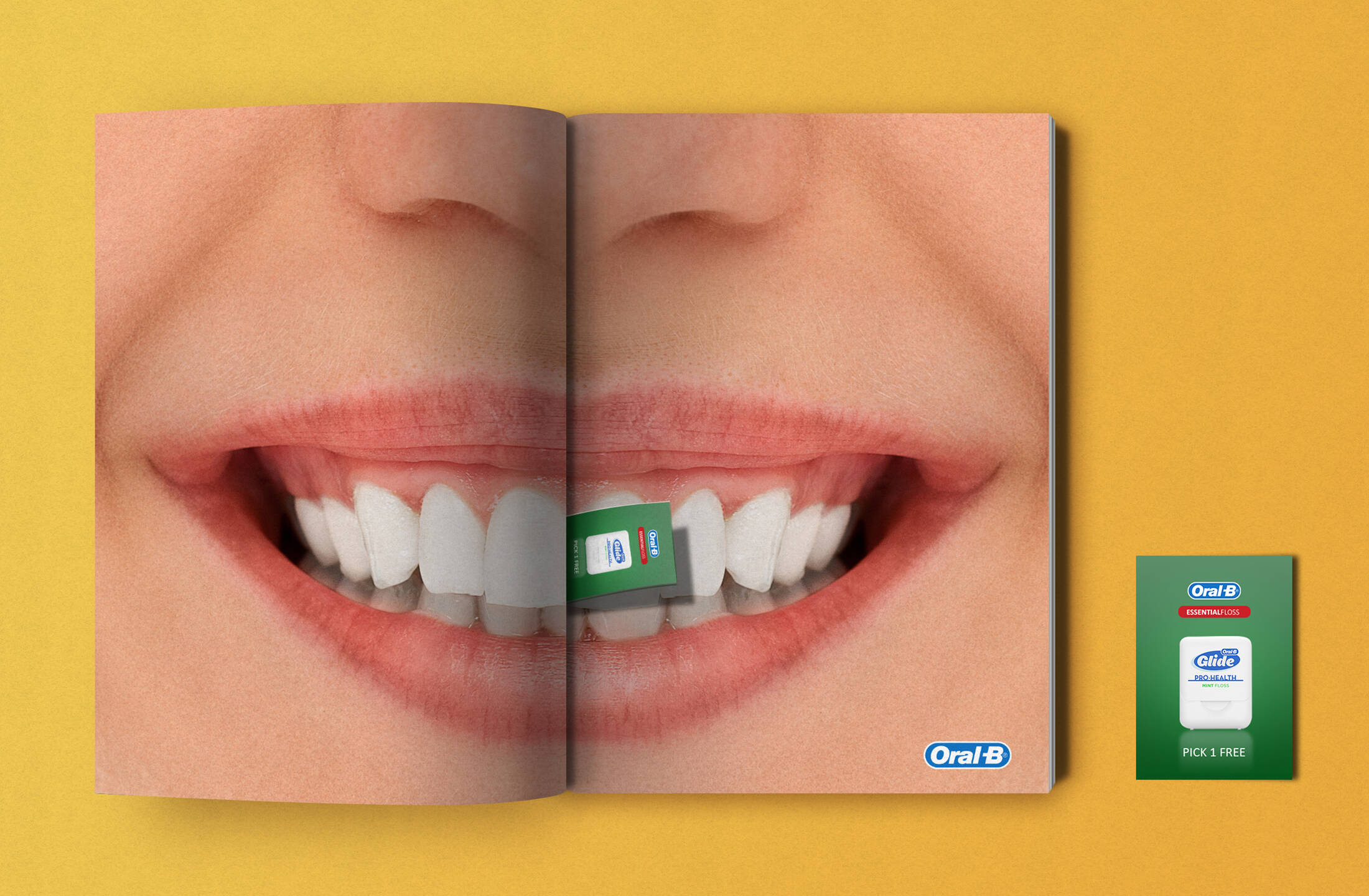 A promotional coupon, for a free dental floss box, that is stuck between the magazine teeth, just like a piece of...coupon. This ad shows the magazine and placement mockup.