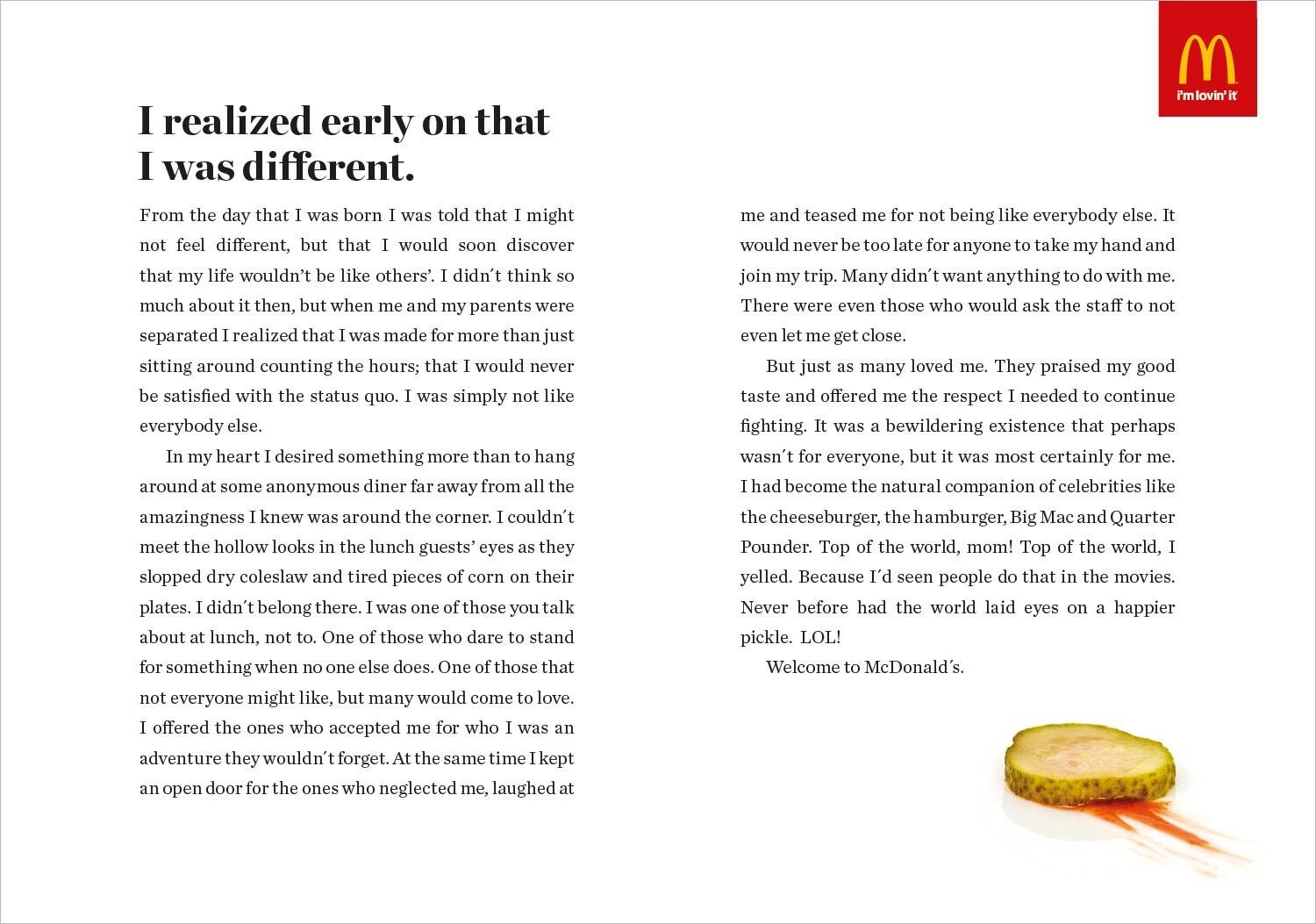 This professional campaign titled 'Pickle' was published in Sweden in January, 2015. It was created for the brand: McDonald's, by ad agency: DDB. This Print medium campaign is related to the Food industry and contains 1 media asset. It was submitted almost 11 years ago.