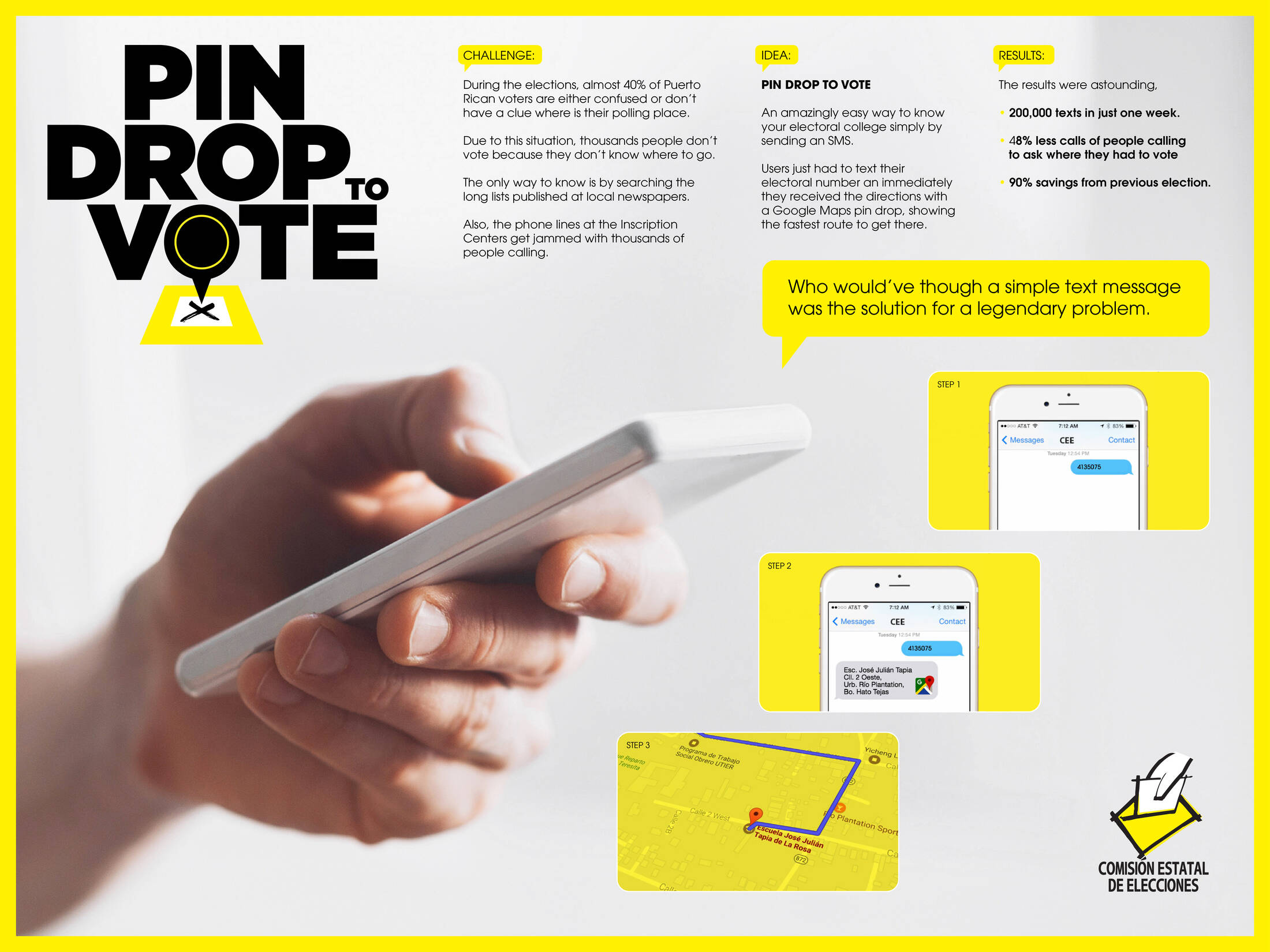 This professional campaign titled 'Pindrop to Vote' was published in Puerto Rico in April, 2017. It was created for the brand: State Election Commission, by ad agency: McCann. This Digital medium campaign is related to the Public Interest industry and contains 2 media assets. It was submitted over 8 years ago.