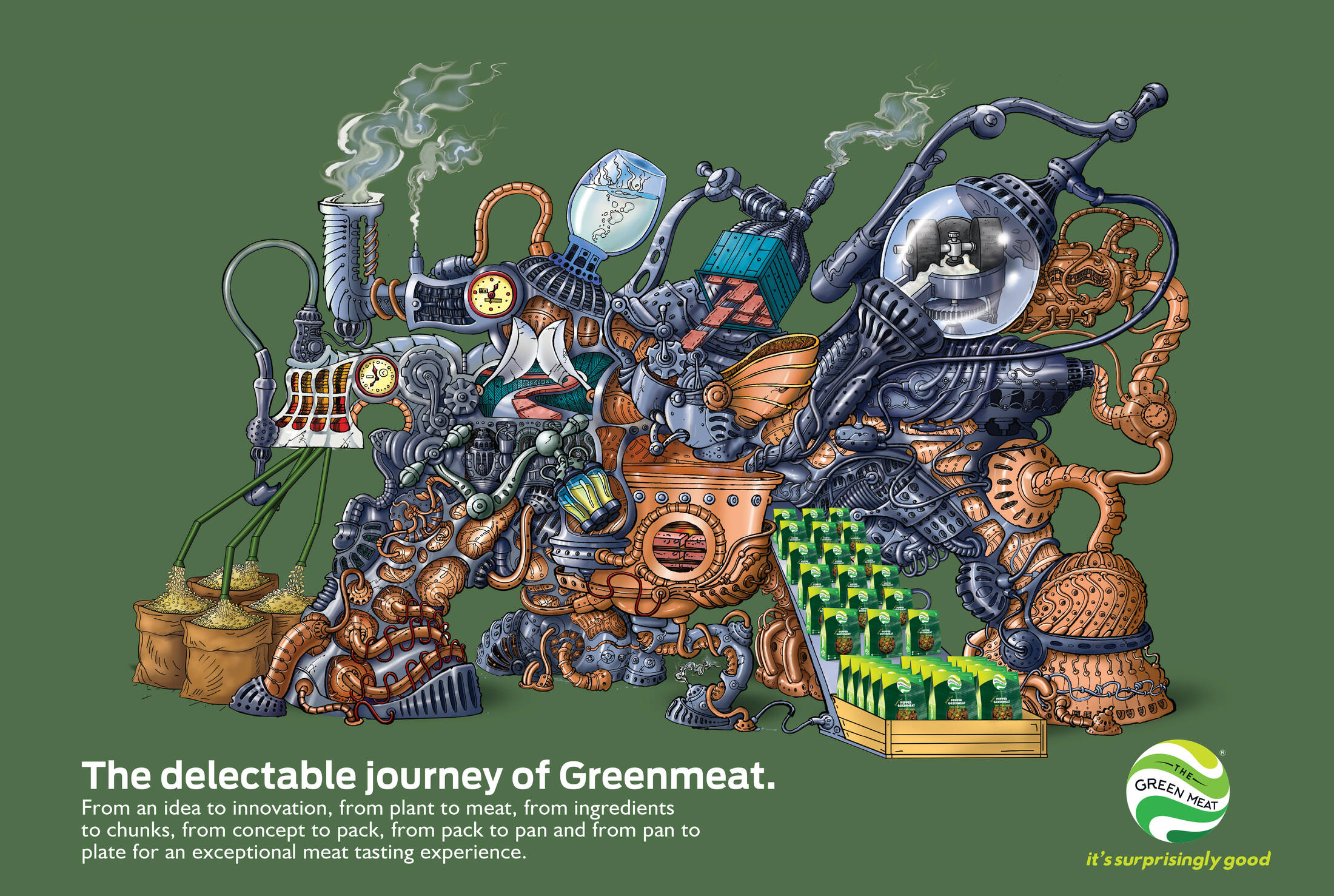 A poster to illustrate the process of manufacture of plant based meat. From plant to meat. Instead of showing machinery as is, a quirky way to um-machinize the process was taken.