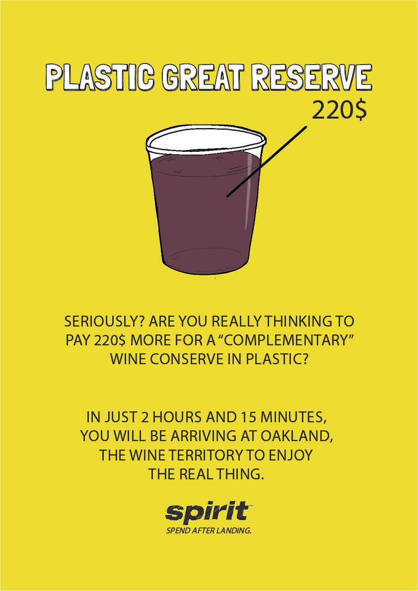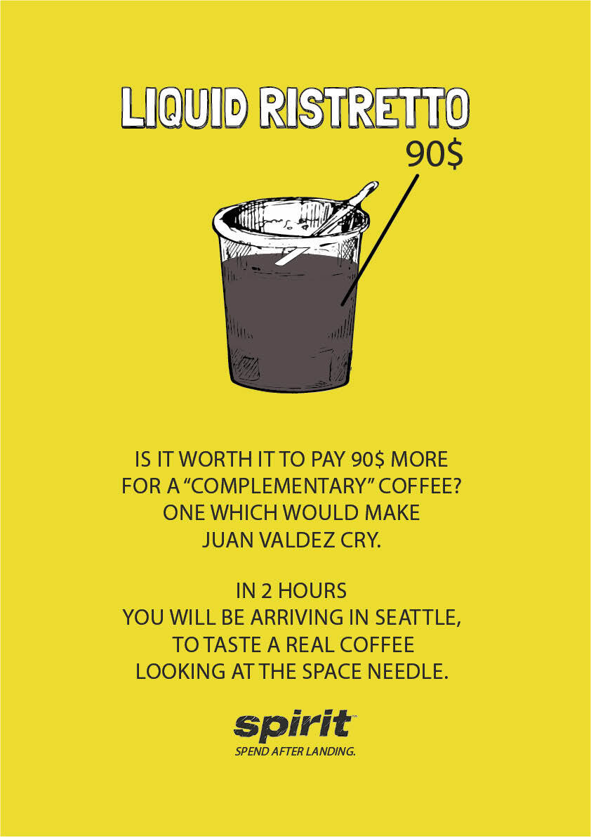 This student campaign titled 'Plastic Great Reserve, Liquid Ristretto, Flying Peanuts, ...' was published in United States in August, 2018. It was created for the brand: Spirit, by ad school: Miami Ad School. This Print medium campaign is related to the Transport industry and contains 5 media assets. It was submitted over 7 years ago.
