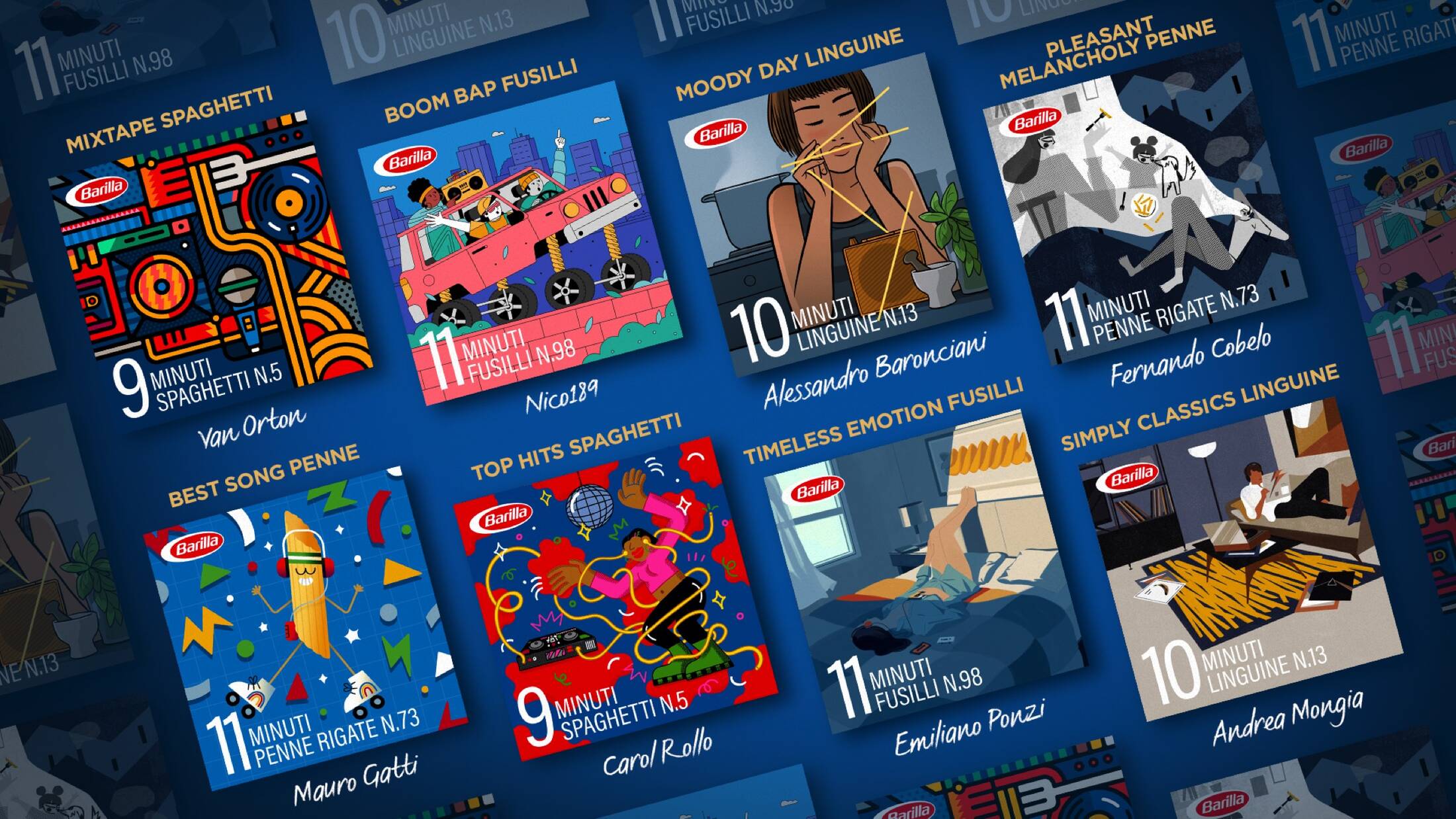 With the 8 collections of "Playlist Timer" Barilla, therefore, transforms Spotify into the most symphonic of kitchen timers, a perfect and modern synthesis between utility and art: musical, culinary and figurative, thanks to the original covers of the playlists, created by Italian artists of international calibre: Emiliano Ponzi, Van Orton, Alessandro Baronciani, Mauro Gatti, Carol Rollo, Nicola "Nico189" Laurora, Fernando Cobelo and Andrea Mongia.