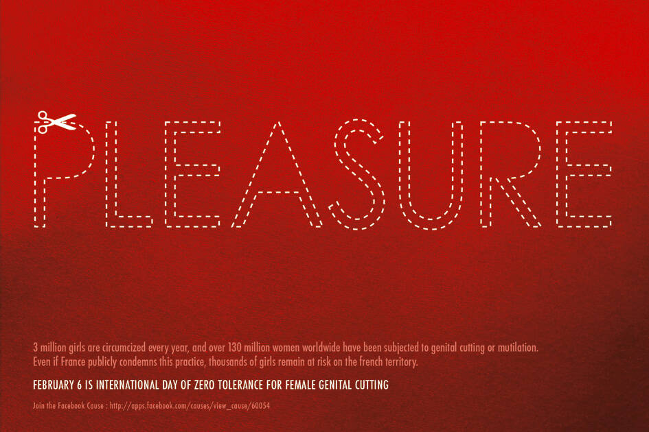 This professional campaign titled 'Pleasure' was published in France in February, 2008. It was created for the brand: International Day of Zero Tolerance for Female Genital Cutting, . This Print medium campaign is related to the Public Interest industry and contains 1 media asset. It was submitted almost 18 years ago.