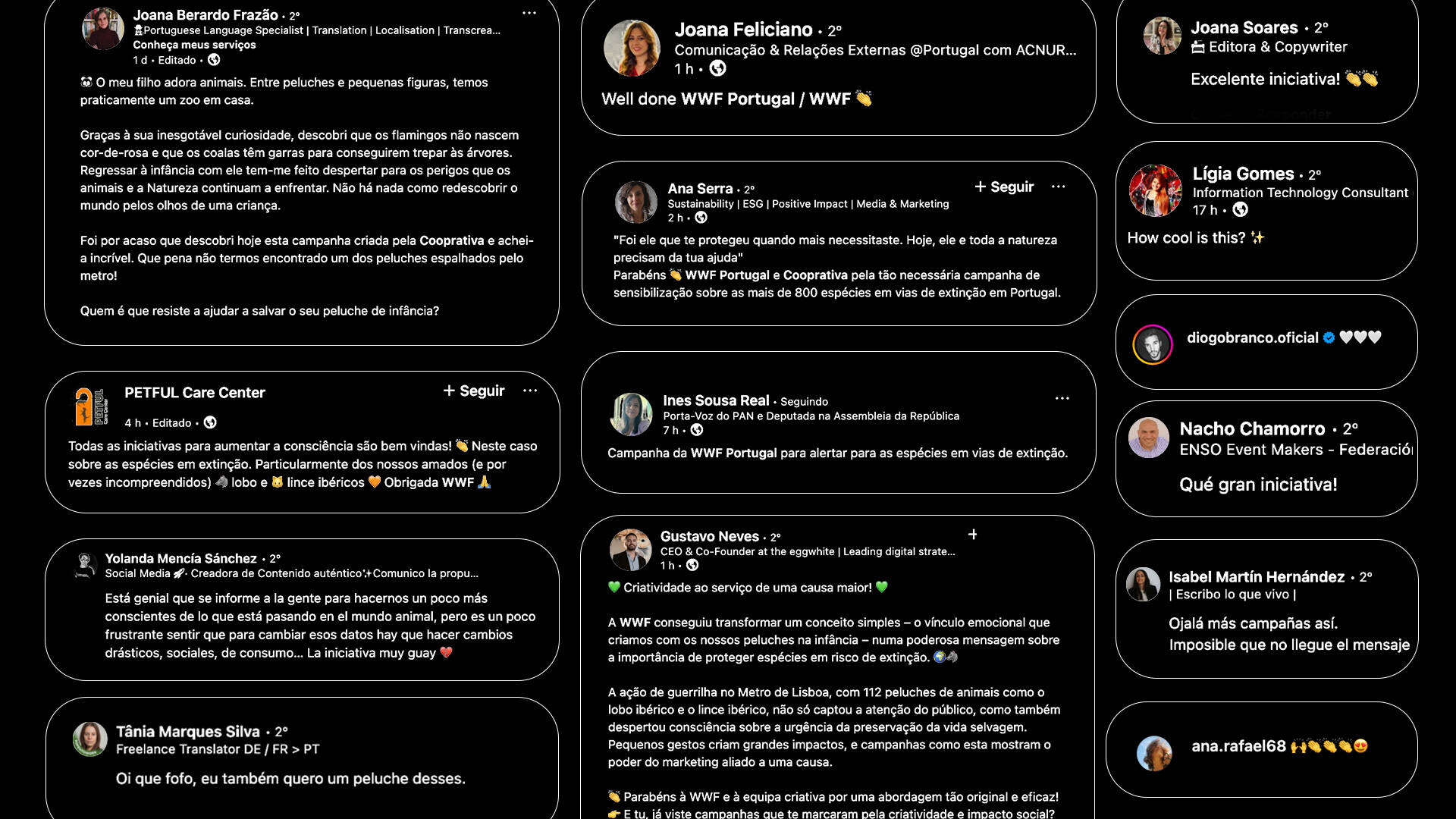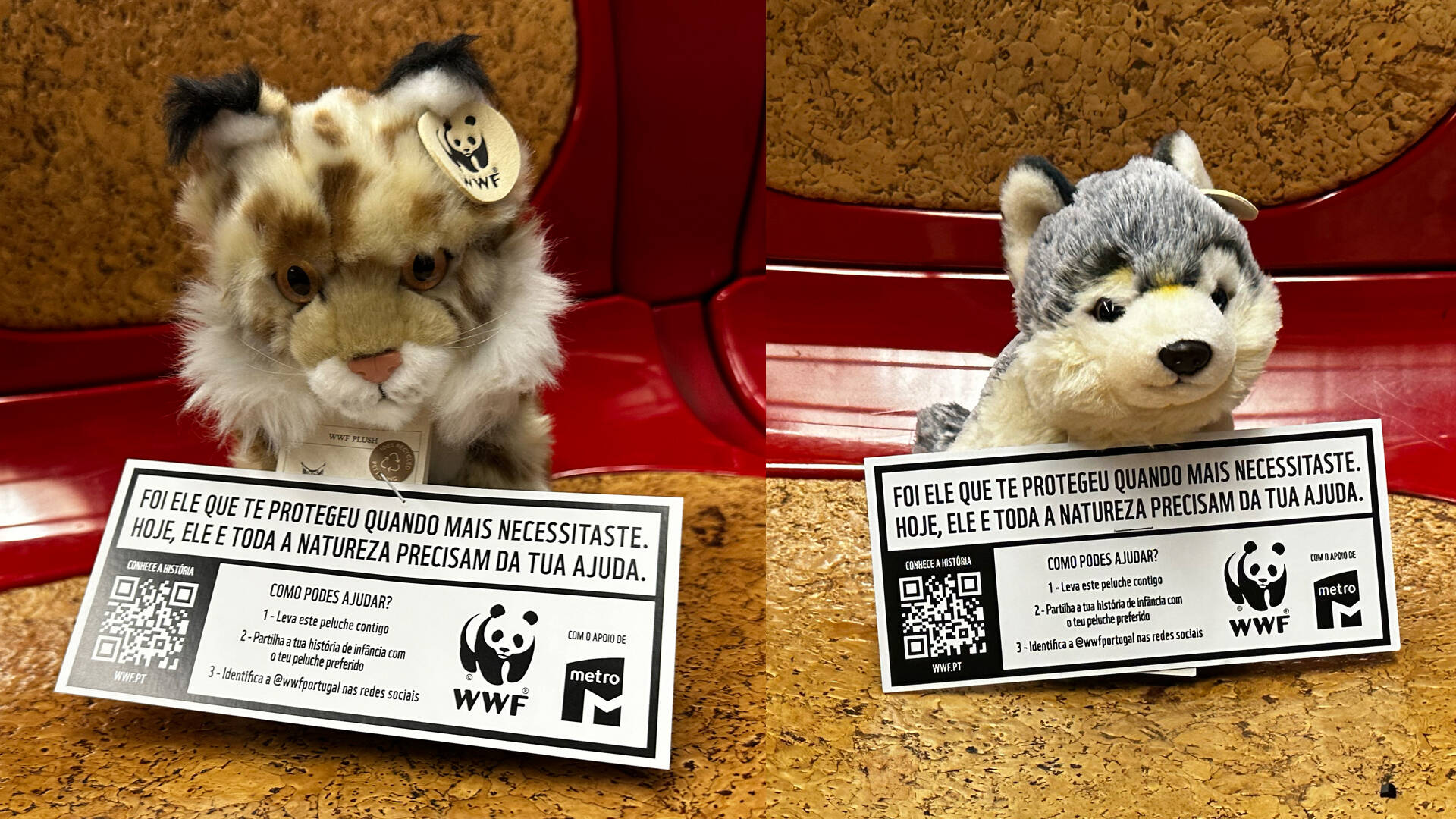 As part of the World Wildlife Day campaign, we had a very special debut event, with 112 stuffed animals that were “on the loose” in the Lisbon Metro, a partner of the initiative. Anyone travelling on the metro could find a stuffed Iberian wolf or Iberian lynx. Each stuffed animal has a QR code that directs to the WWF Portugal website. People will be able to share their stories about the importance of their stuffed animals in their childhood and reinforce the campaign message.