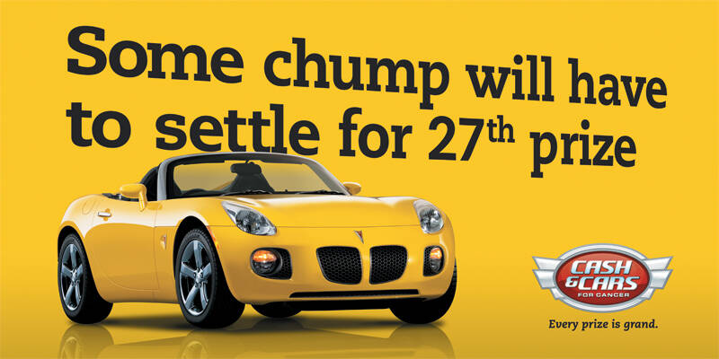 This professional campaign titled 'Pontiac, Smart' was published in Canada in November, 2007. It was created for the brand: Cash and Cars Lottery, by ad agency: Calder Bateman. This Print medium campaign is related to the Gaming industry and contains 2 media assets. It was submitted about 18 years ago.