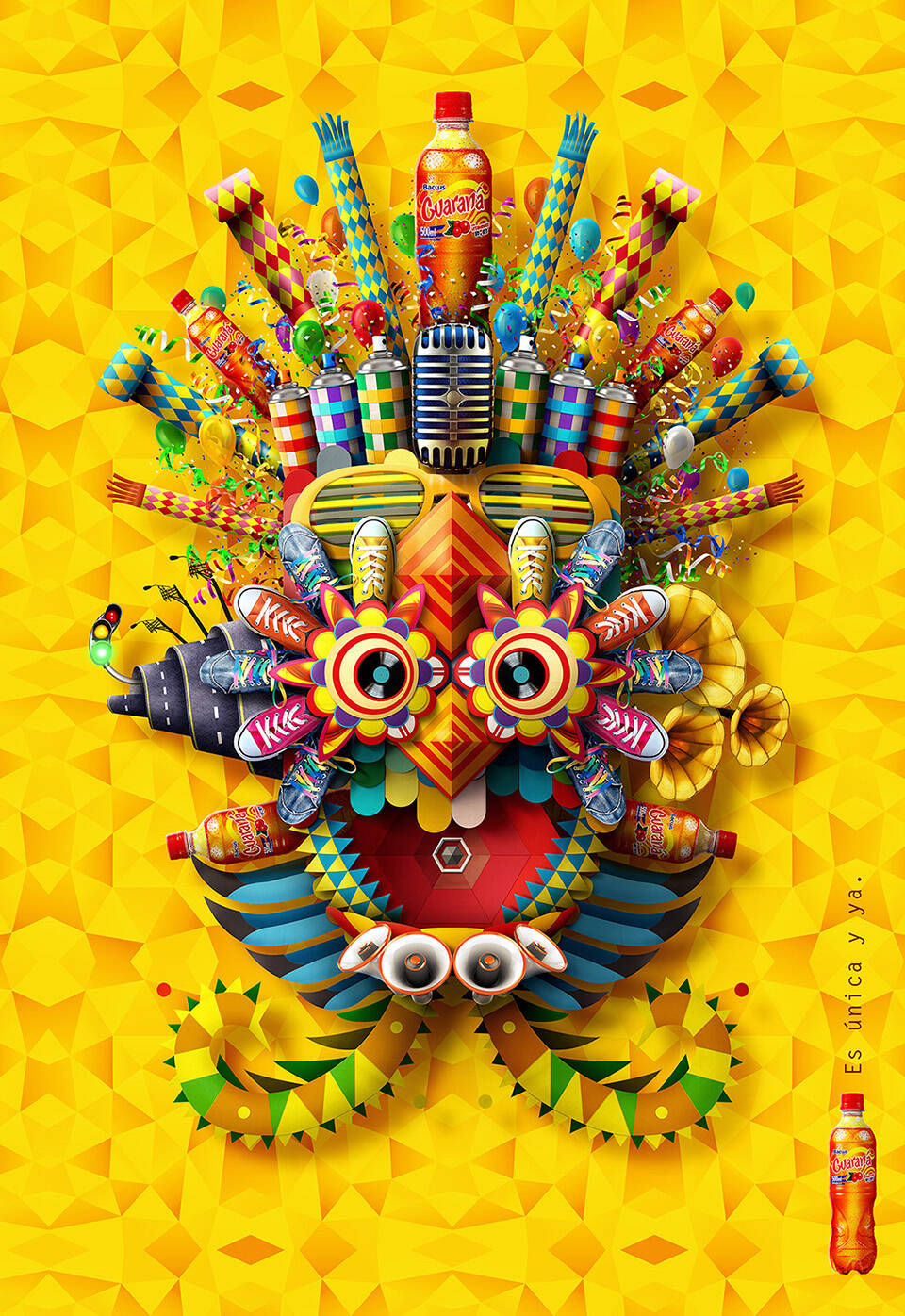 SabMiller needed to spread the word about its soft drink made from guarana, the only one of its kind in the Peruvian market. The graphic art transmits all of the things that go through a young person's head, that are part of him or her, and that make him or her unique. Our inspiration came from the beautiful masks used in the Candelaria festival in Puno, in the southern Peruvian Andes.