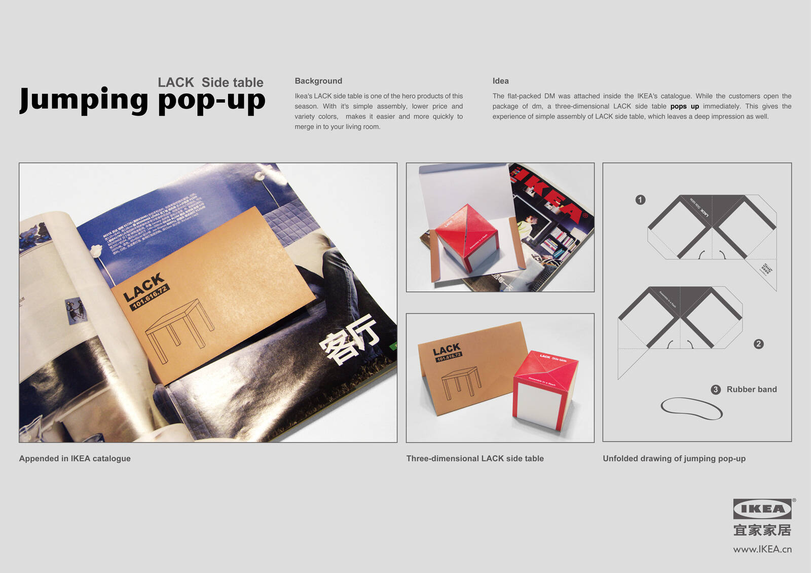 The flat-packed DM was attached inside the IKEA's catalogue. While the customers open the package of dm, a three-dimensional LACK side table pops up immediately. This gives the experience of simple assembly of LACK side table, which leaves a deep impression as well.