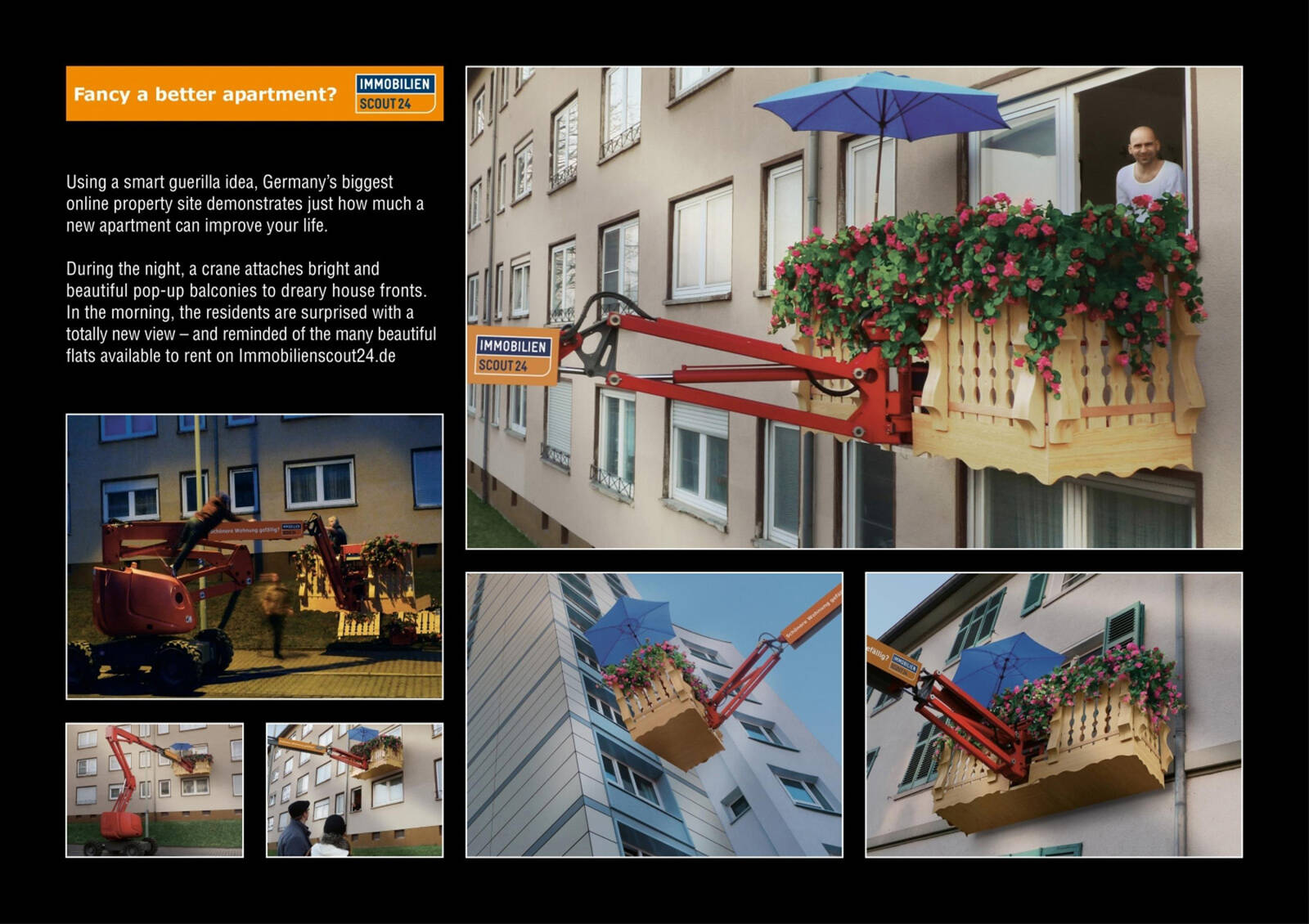 Using a smart guerilla idea, Germany’s biggest online property site demonstrates just how much a new apartment can improve your life. During the night, a crane attaches bright and beautiful pop-up balconies to dreary house fronts. In the morning. the residents are surprised with a totally new view — and reminded of the many beautiful flats available to rent on lmmobilienscout24.de