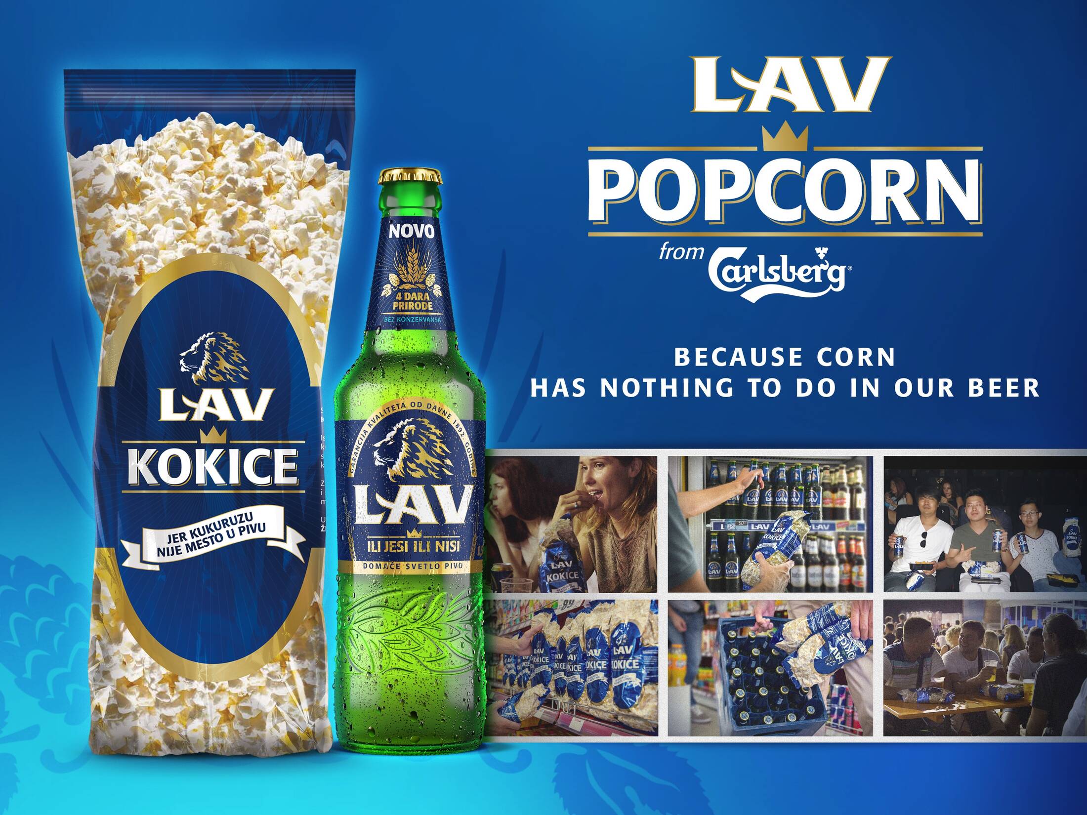 Lav beer, a local Serbian brew produced and bottled by Carlsberg, changed and improved its taste after a decade. Lav is now made of only premium ingredients like barley, hops, water and yeast and does not feature corn in its beverage anymore. To excite Lav’s customers about this new development and answer a communication problem non-standard way, we decided to create a product out of left over ingredient – corn. We literally took out the corn out of Lav’s beer and turned it into a popcorn, featured as a free giveaway in supermarkets, bars, movie theaters and events.