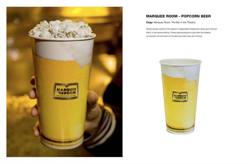 This professional campaign titled 'Popcorn beer' was published in Canada in October, 2008. It was created for the brand: Marquee Room, by ad agency: Highwood. This Ambient medium campaign is related to the Recreation, Leisure industry and contains 1 media asset. It was submitted about 17 years ago.