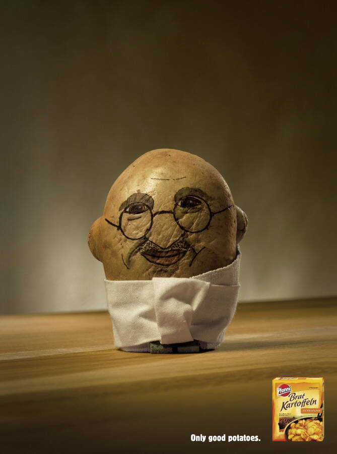 This professional campaign titled 'Potatoheads, Gandhi' was published on September 01, 2006. This Print medium campaign is related to the Food industry and contains 1 media asset. It was submitted over 18 years ago.
