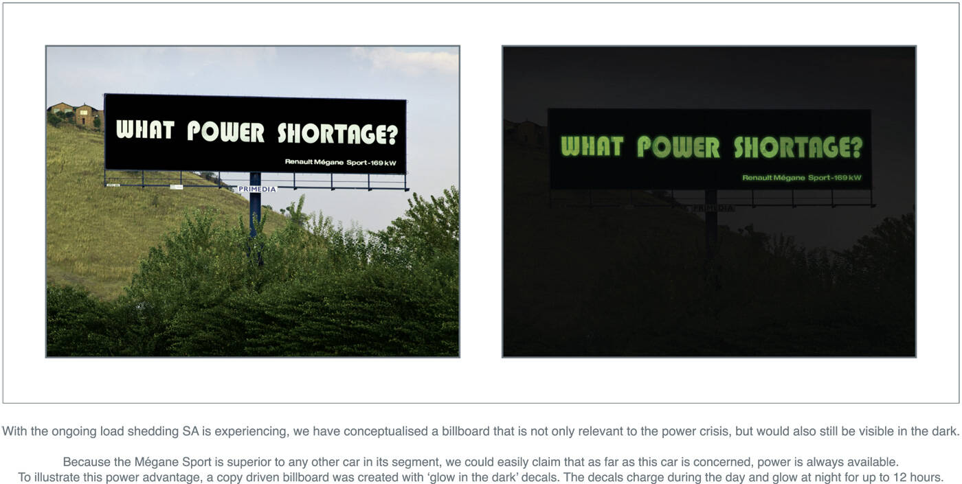 This professional campaign titled 'Power' was published in South Africa in March, 2008. It was created for the brand: Renault, by ad agency: Publicis. This OOH Outdoor medium campaign is related to the Automotive and Personal Transportation industry and contains 1 media asset. It was submitted over 17 years ago.