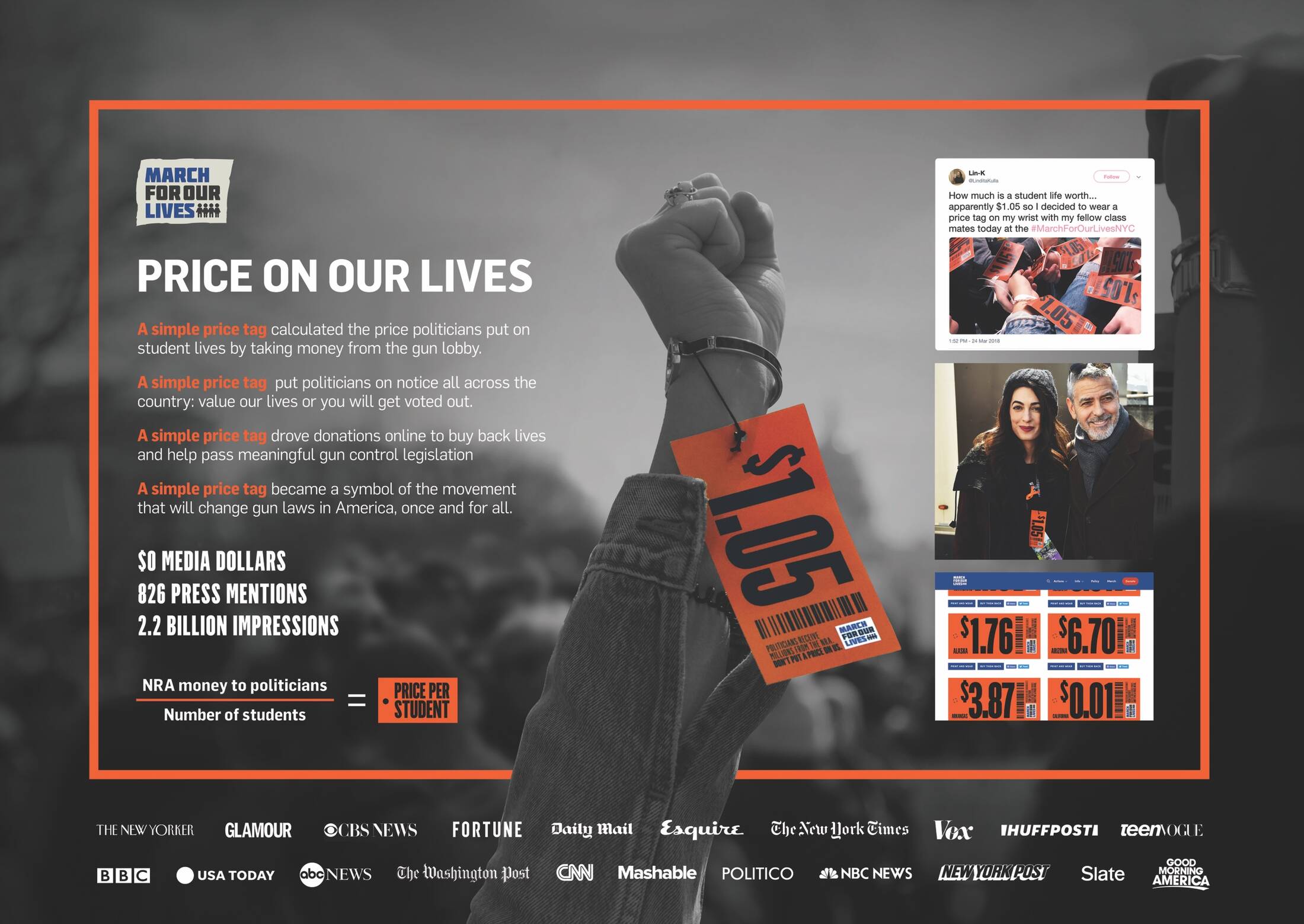 This professional campaign titled 'Price on Our Lives' was published in United States in March, 2018. It was created for the brand: March For Our Lives, by ad agency: McCann. This Static Images medium campaign is related to the Public Interest industry and contains 2 media assets. It was submitted about 7 years ago.