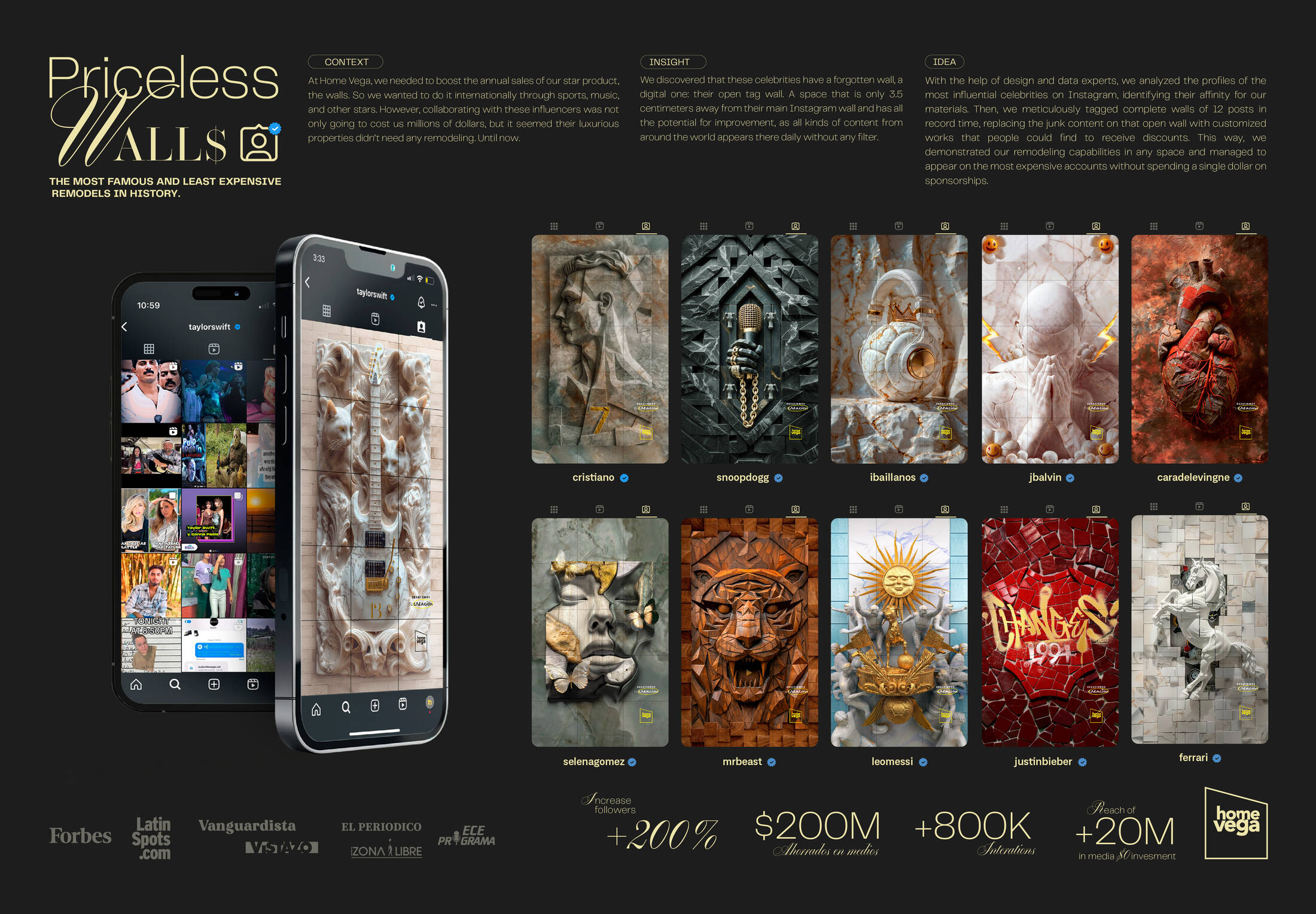 Home Vega discovers that its star product, walls, not only exists in the physical world but also in the digital realm. As experts in remodeling, we decided to transform the wall of the most famous—specifically, the tag wall of influential celebrities like Lionel Messi, Cristiano Ronaldo, Selena Gomez, J Balvin, Mr. Beast, Beyoncé, and others who needed this renovation. This strategy allowed us to gain the exposure we desired without spending a dime on traditional advertising. The "Priceless Walls" campaign not only redefines the promotion of our products but also positions Home Vega as a leader in the remodeling sector in Ecuador. Additionally, we launched an interactive promotion where followers must search for the walls to win discounts, making this experience even more exciting and engaging.