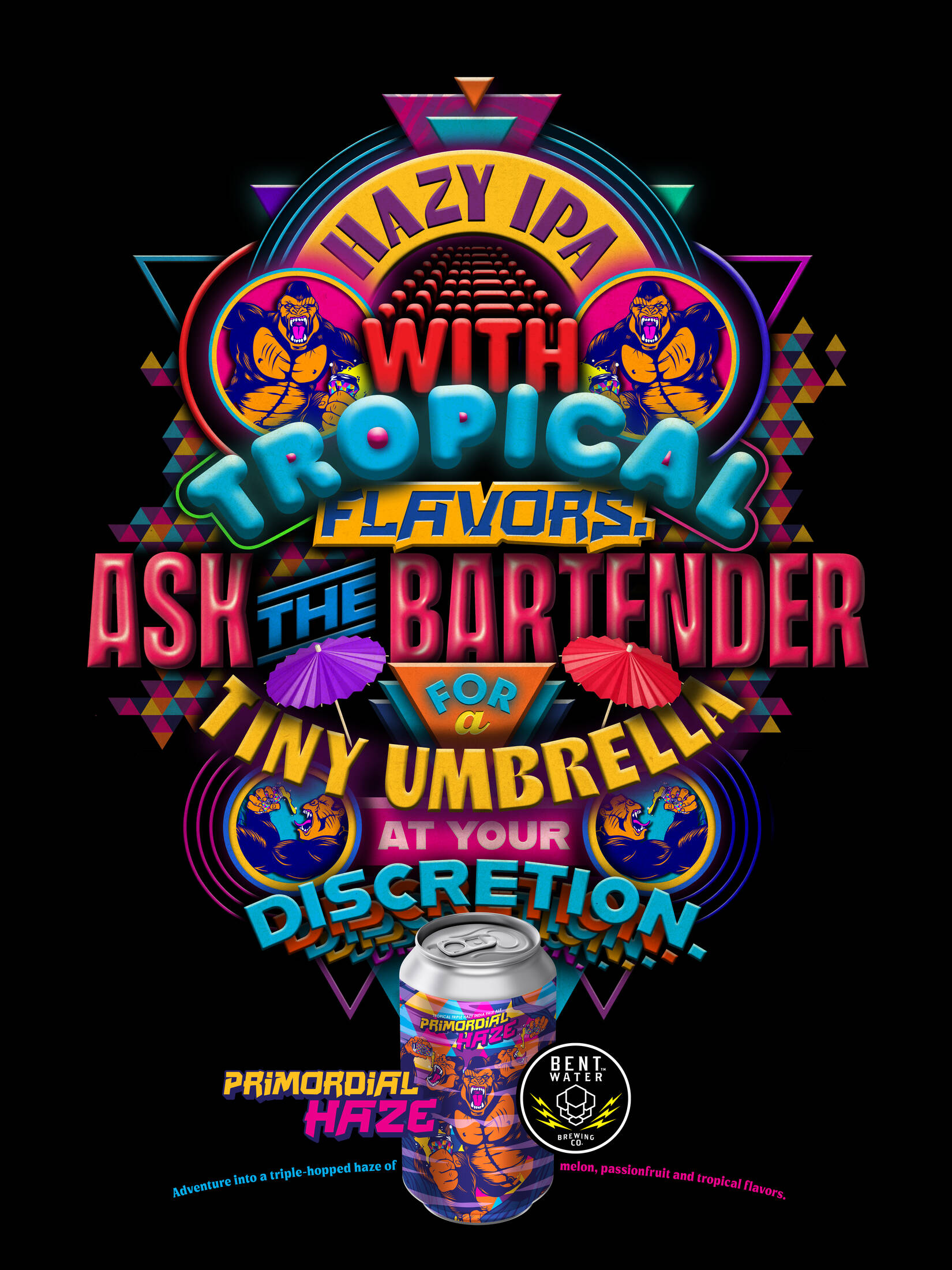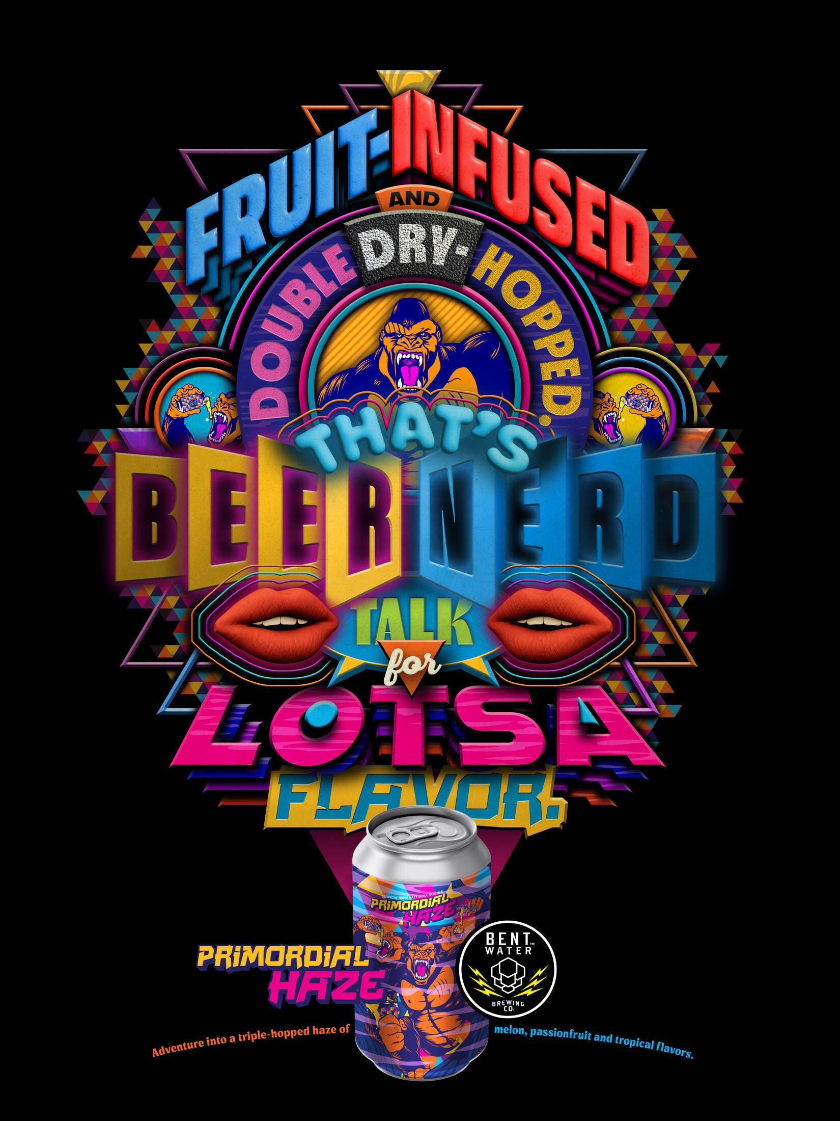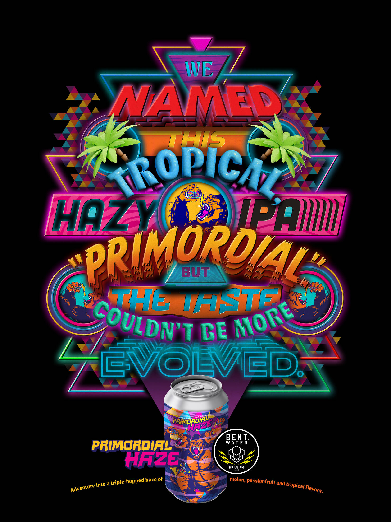 “Primordial Haze” - Bent Water’s new triple-hopped Hazy IPA with hints of tropical fruits - is a delicious collision of flavors. To visually get this point across, art director/designer Doug Pedersen used a collision of seemingly incongruently typefaces to create a deliciously bold look.