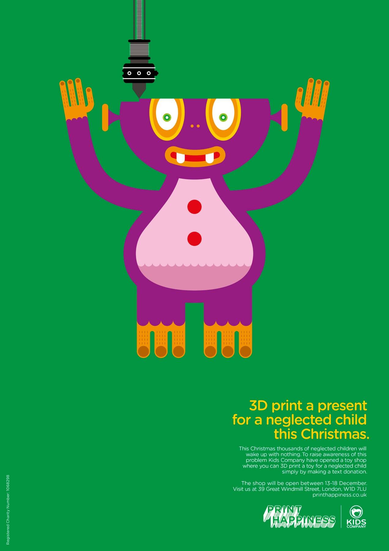 An exclusive 3D printed toy shop to create Christmas presents for vulnerable children. Open to all from Friday 13th December to Wednesday 18th December, ‘Print Happiness’ will, with the help of donations from the public, create toys for Kids Company children who would otherwise not have anything to unwrap on Christmas Day. Six state-of-the-art Ultimaker 3D printers will create the toys live at the bustling Soho site in London. To print a toy, members of the public simply need to make a text donation of £5 to a specific number, and select the toy design of their choice.