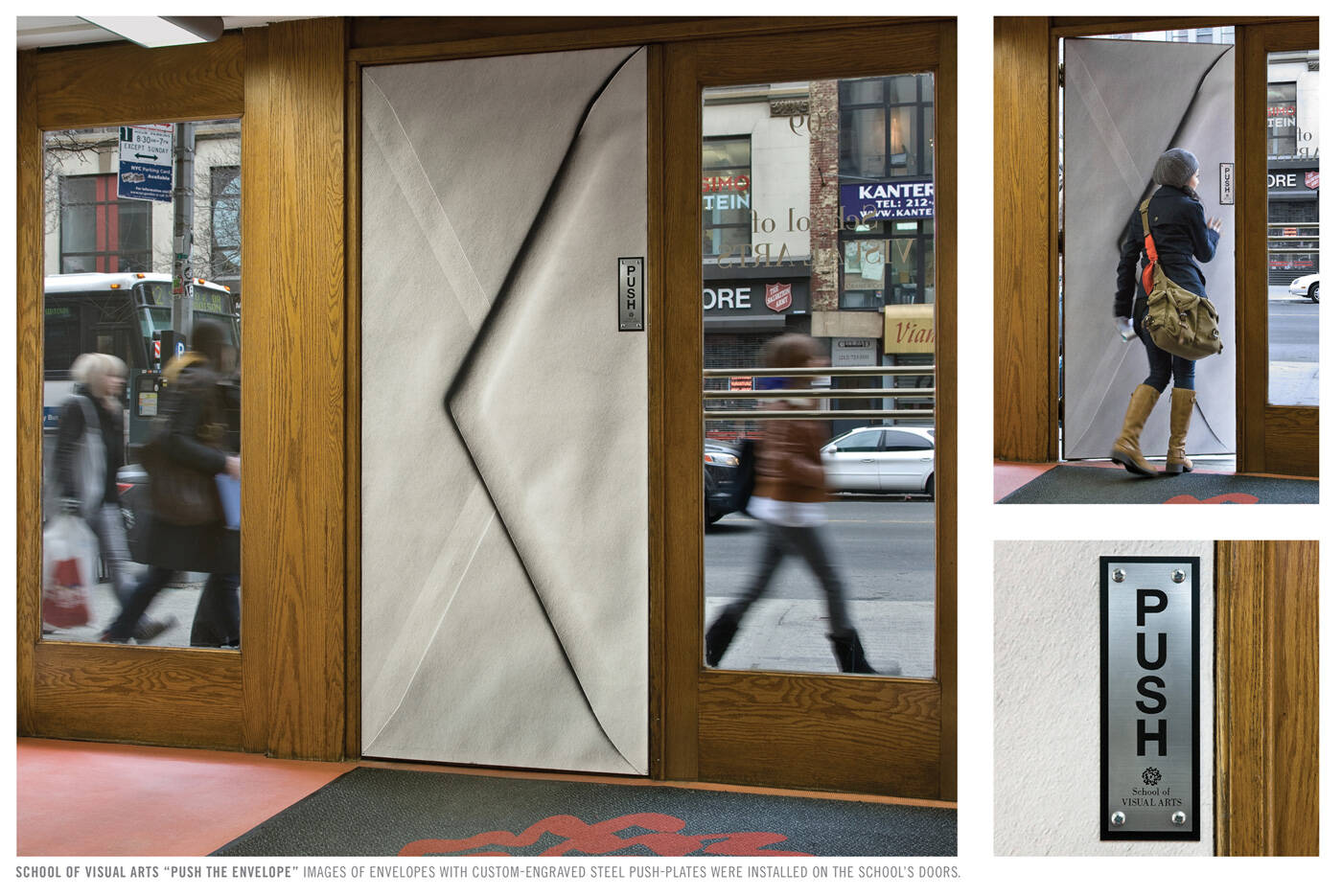 Images of envelopes with custom-engraved steel push-plates were installed on the school’s doors. School of Visual Arts students literally “Pushed The Envelope” while entering and exiting. Translation: "Push The Envelope" is an American phrase which means to innovate or go beyond commonly accepted boundaries.