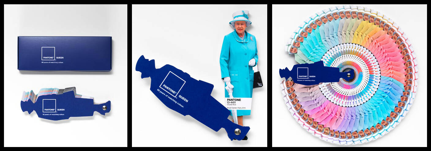 Queen Elizabeth II is an icon of style. For 60 years she has colour matched her clothing perfectly. As any Queen should. And to celebrate the 2012 Diamond Jubilee, Leo Burnett and Pantone have created a colour guide book detailing some of those famous single colour outfits, with their matching Pantone reference and the date she wore them.