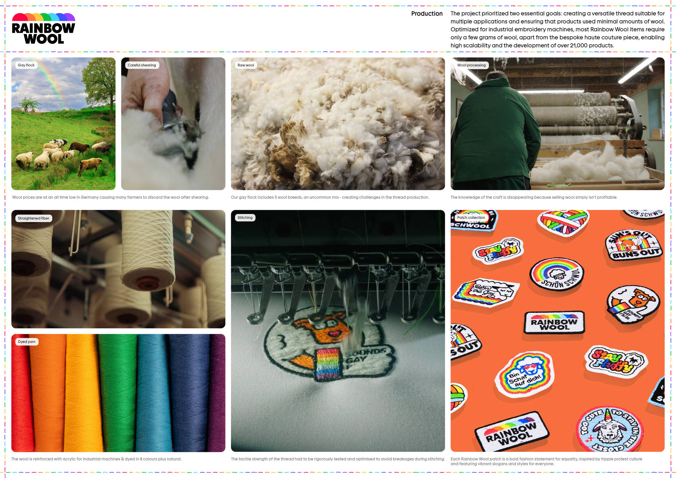 The wool for Rainbow Wool comes from the farm of shepherd Michael Stücke in Löhne, North Rhine-Westphalia. Stücke, a member of the Gayfarmer Association, produces yarn for various creative applications. This yarn is spun from the wool of over 20 gay sheep. While gay rams typically have no “value” in industrial farming and are often slaughtered, they live full lives at Rainbow Wool Farm, providing high-quality wool for statement fashion pieces.