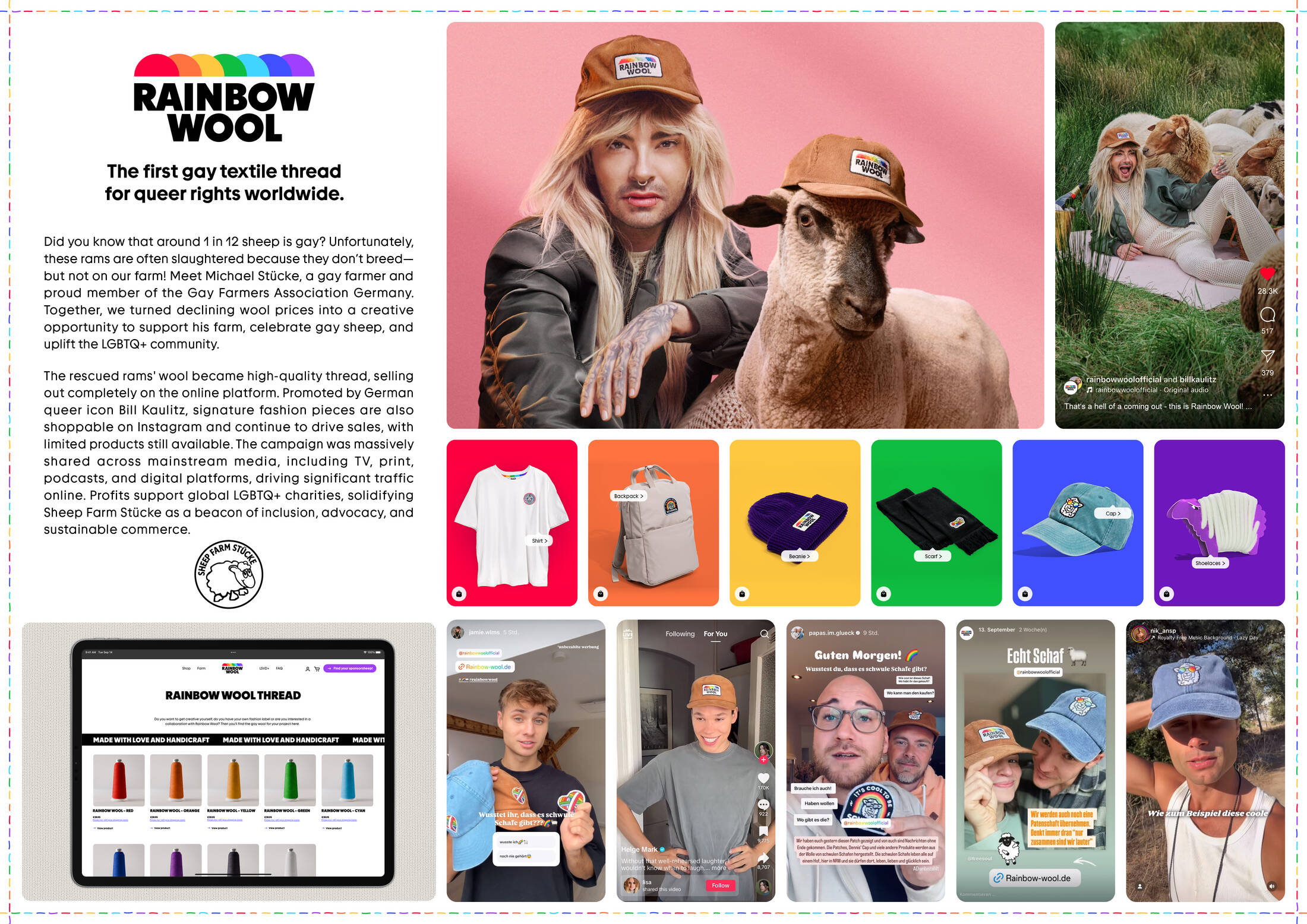 This professional campaign titled 'Rainbow Wool' was published in Denmark in September, 2024. It was created for the brands: LSVD+ and Schäferei Stücke, by ad agency: Serviceplan Group. This Integrated medium campaign is related to the Fashion industry and contains 6 media assets. It was submitted about 1 year ago.