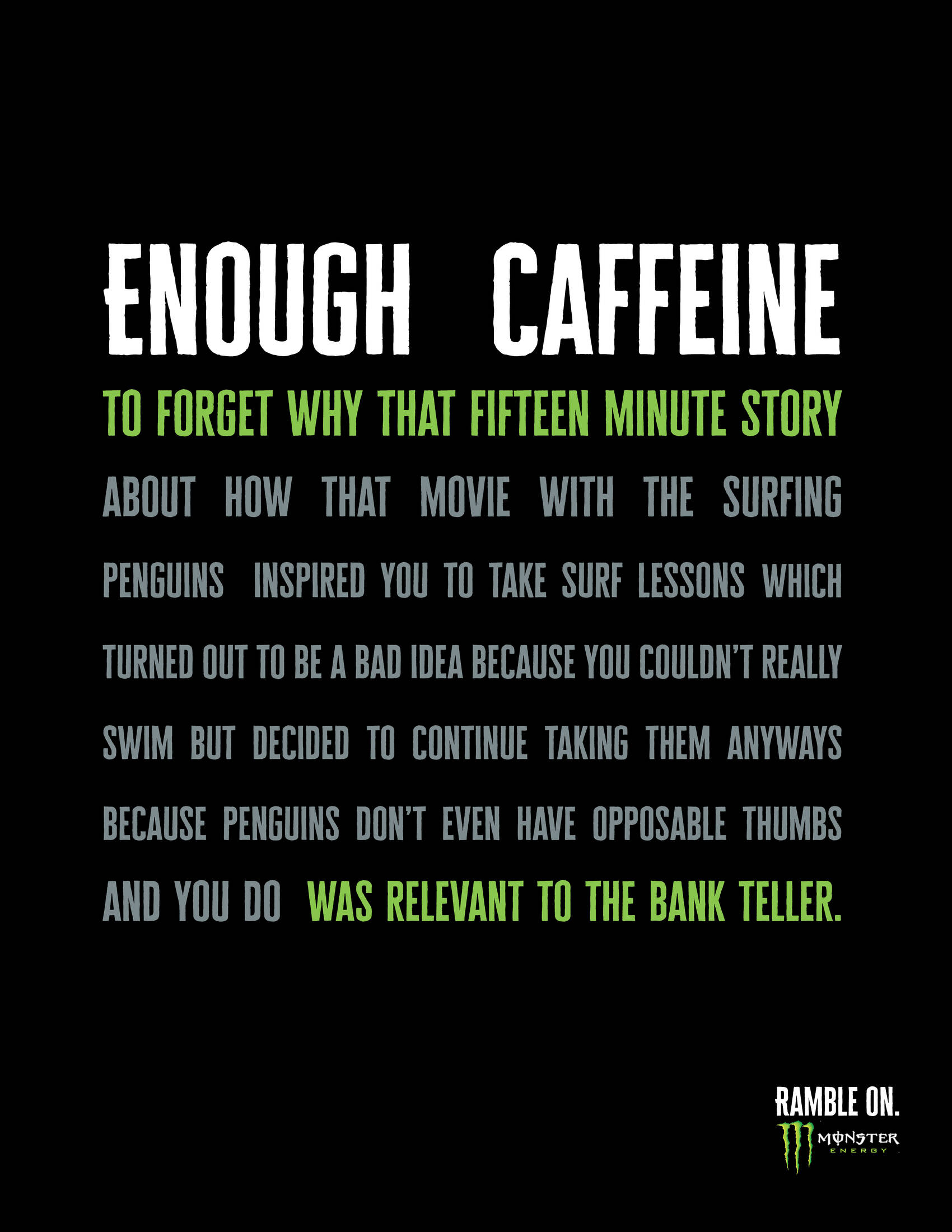 People tend to be chatty when they have a lot of energy-- Monster Energy drinks contain enough caffeine to get a person rambling.
