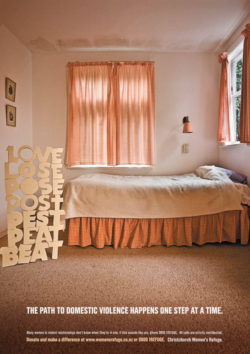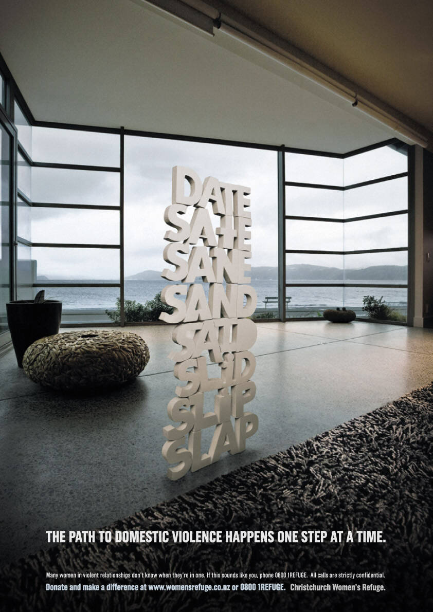 This professional campaign titled 'Rape, Beat, Slap' was published in New Zealand in July, 2009. It was created for the brand: Christchurch Women's Refuge, . This Print medium campaign is related to the Public Interest industry and contains 3 media assets. It was submitted over 16 years ago.