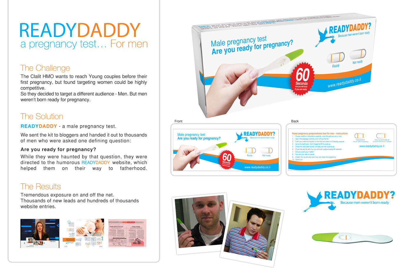 This professional campaign titled 'Ready Daddy' was published in Israel in June, 2010. It was created for the brand: Clalit, by ad agency: Twisted. This Ambient medium campaign is related to the Pharmaceutical industry and contains 1 media asset. It was submitted over 15 years ago.