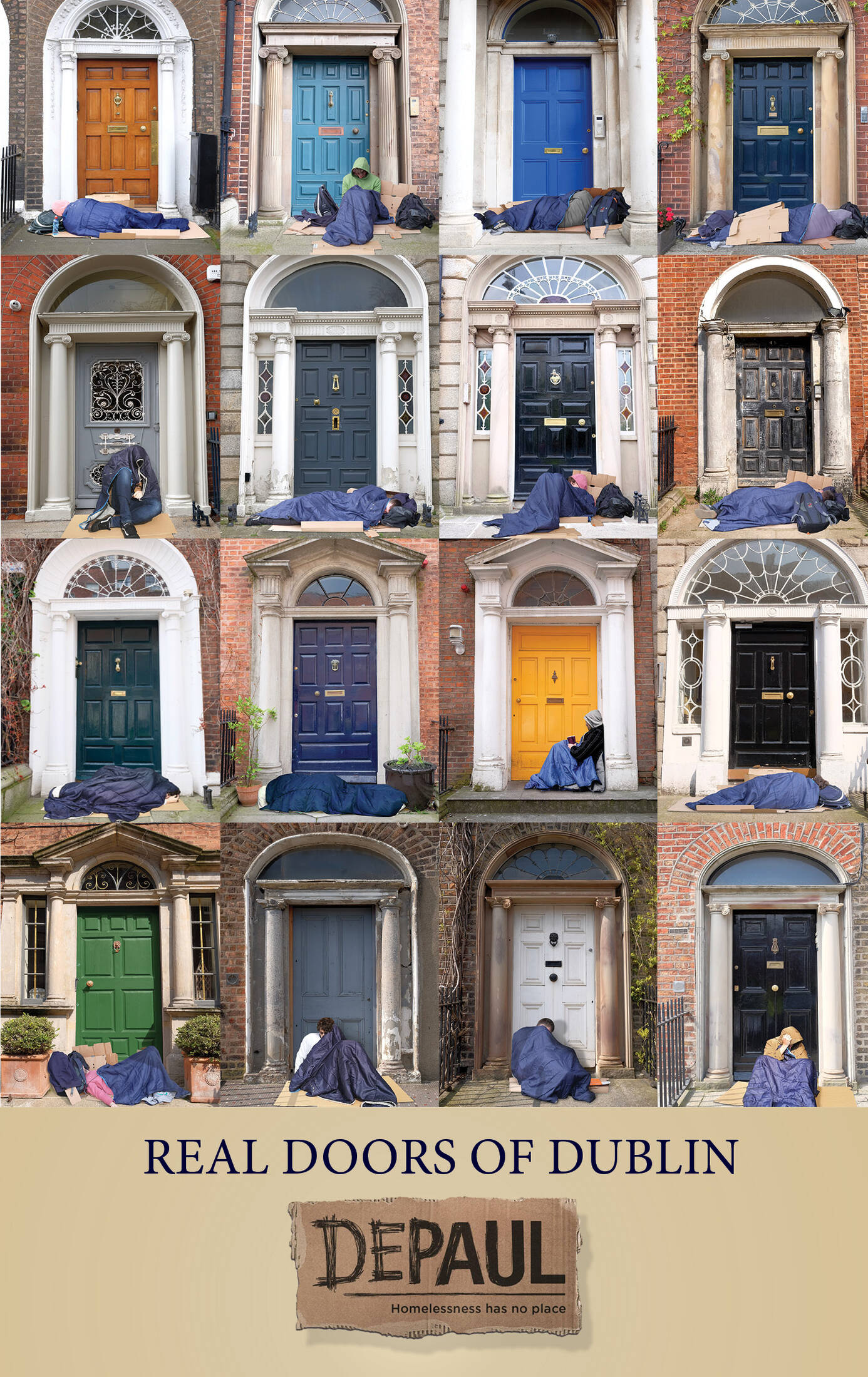 The Doors of Dublin is a well known and popular tourist image of the city sold in all the tourist shops. To challenge the growing indifference to homelessness we literally put homelessness in the picture.