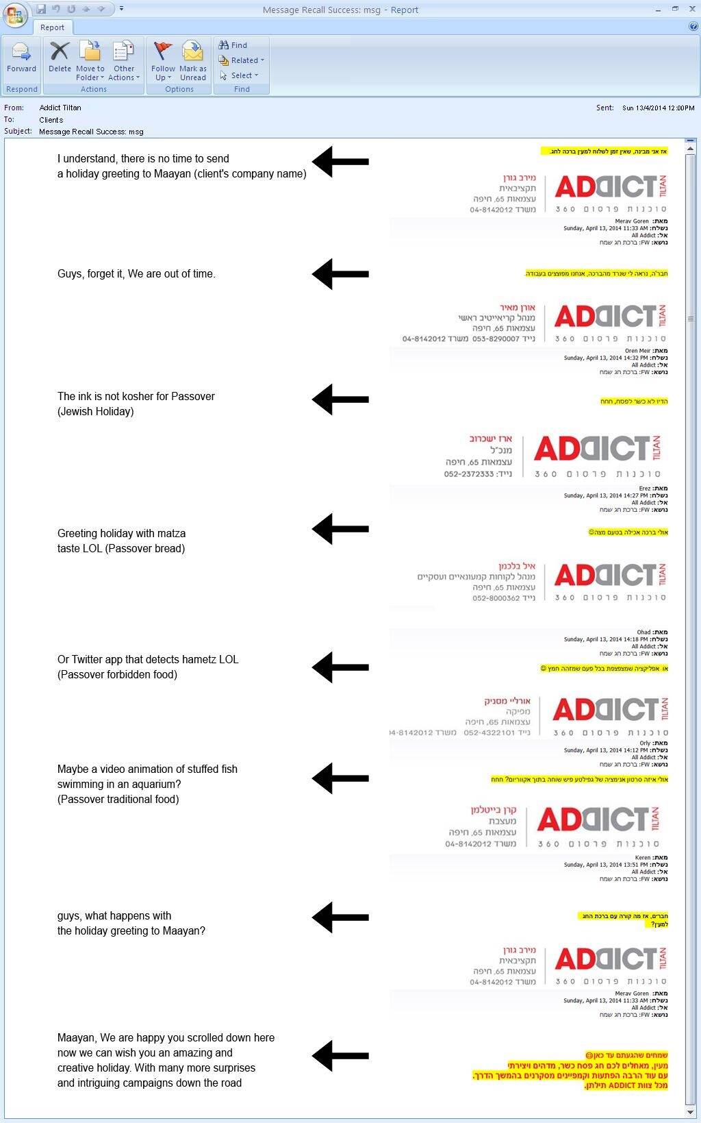 This professional campaign titled 'Recall Incident Holiday Greeting' was published in Israel in April, 2014. It was created for the brand: Addict, by ad agency: Addict. This Static Images medium campaign is related to the Agency Self-Promo industry and contains 1 media asset. It was submitted over 11 years ago.