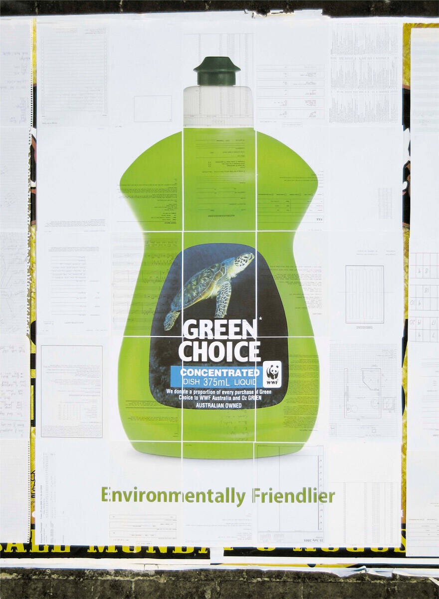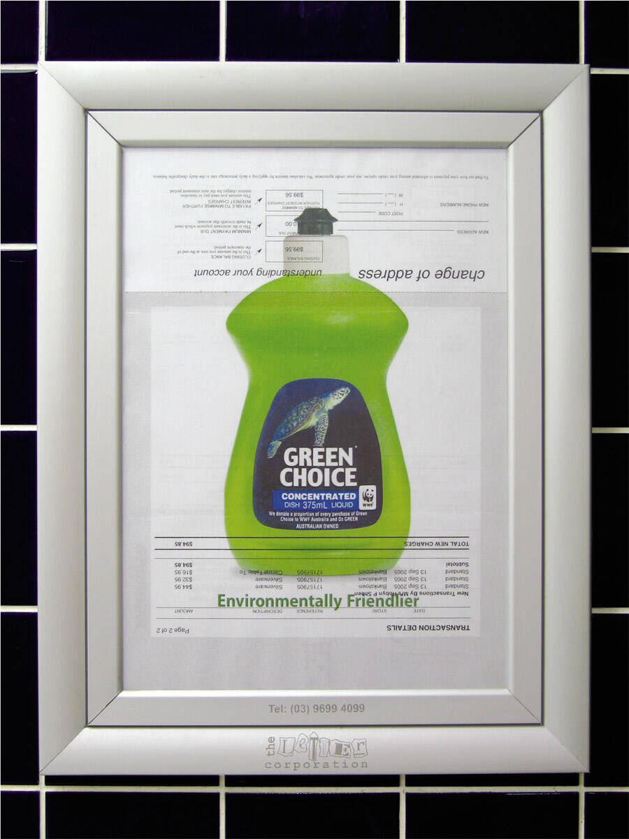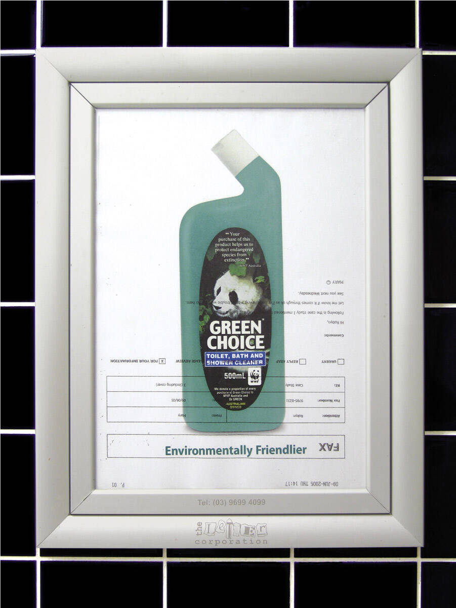 The idea was to advetise Green Choice's environmentally friendly products by making ads that were themselves environmentally friendly. Posters were printed on reused scrap paper that had been previously destined for landfill. This poster was printed on office waste paper, eg. faxes, photocopies and emails.