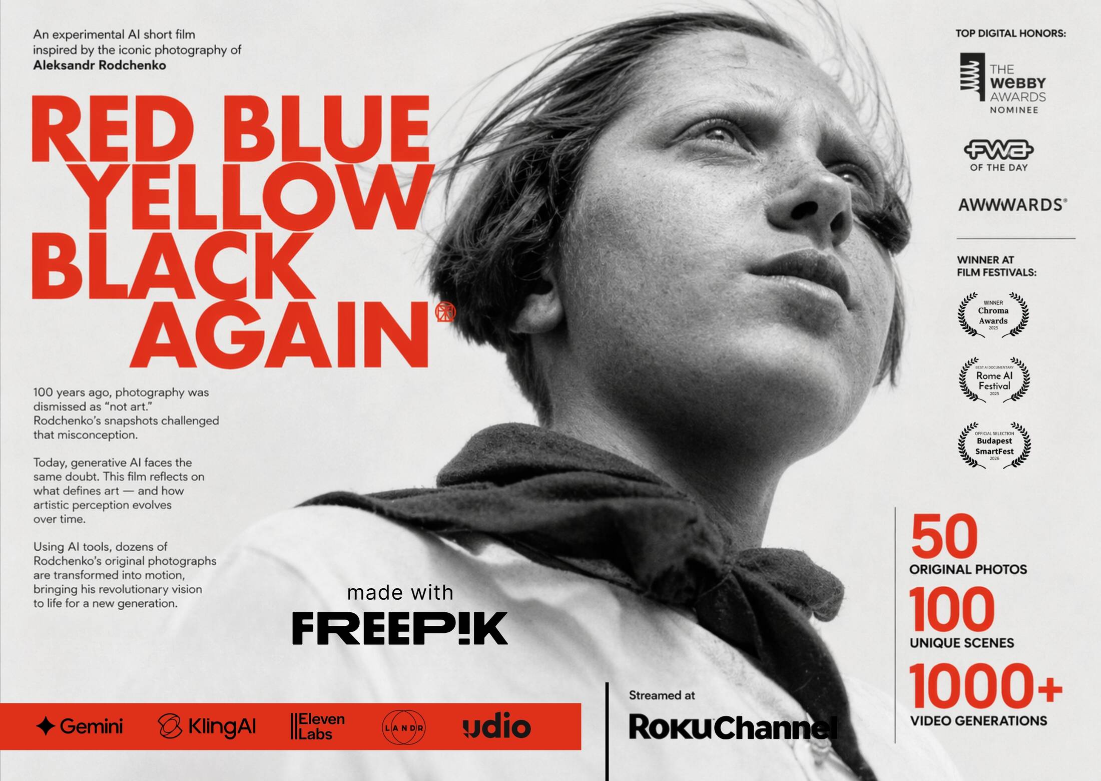 Red Blue Yellow Black Again is an experimental project created in partnership with Magnific (formerly Freepik) - a leading AI creative tools platform. The project reimagines the work of photography pioneer Aleksandr Rodchenko through AI to showcase the creative powers of modern generative tools. 100 years ago, photography was largely deemed as non-art, and Rodchenko’s radical snapshots challenged this misperception. This AI project reflects on what defines art and how artistic perception evolves over time. The script draws from Rodchenko's original letters and memoirs from over 100 years ago, delivering a hidden message from the last century to brazen and dreaming creators of today. The film resonated both online and offline: it was screened at international film festivals in cinemas on the big screen, became among the first AI films ever streamed on the global platform Roku, and has been recognised at major digital and innovation festivals such as The Webby Awards, FWA, and The Awwwards.