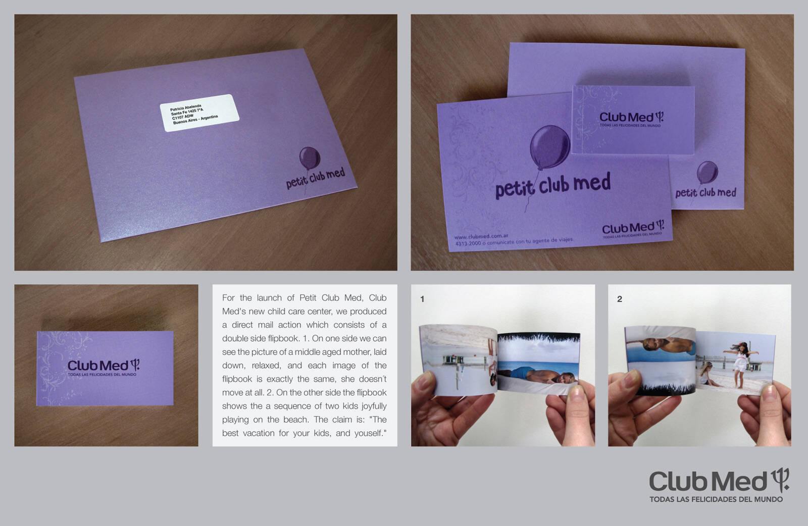 For the launch of Petit Club Med, Club Med's new child care center, we produced a direct mail action which consists of a double side flipbook. 1. On one side we can see the picture of a middle aged mother, laid down, relaxed, and each image of the flipbook is exactly the same, she doesn't move at all. 2. On the other side the flipbook shows the a sequence of two kids joyfully playing on the beach. The claim is: "The best vacation for your kids, and yourself."