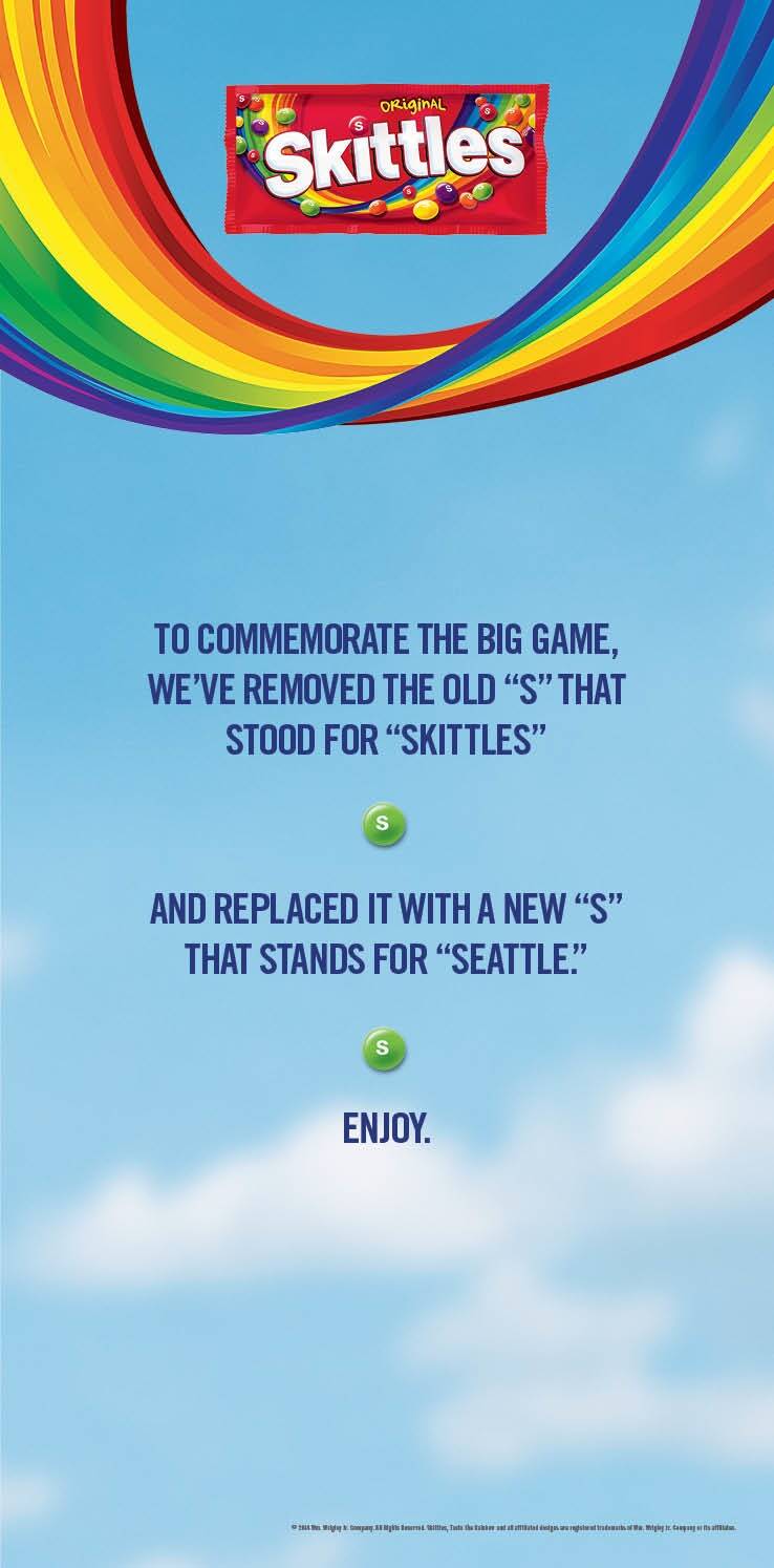 This professional campaign titled 'Replaced the S in Skittles' was published in United States in February, 2014. It was created for the brand: Skittles, by ad agency: DDB. This Print medium campaign is related to the Confectionery, Snacks industry and contains 1 media asset. It was submitted almost 12 years ago.