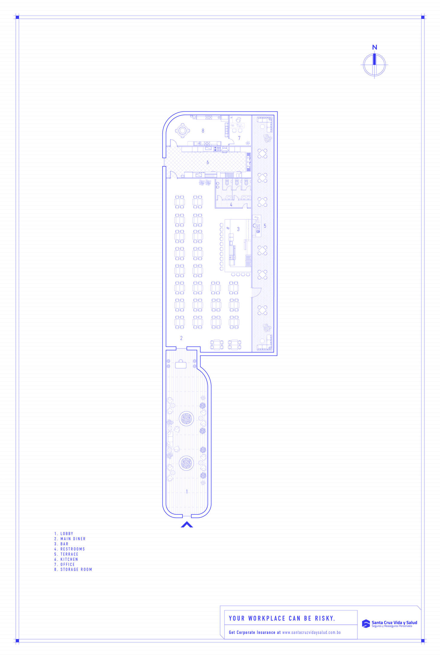 Santa Cruz Vida y Salud and its Corporate Insurance provides coverage against accidents for workers of multiple industries. To inform about this benefit, we made posters referencing the blueprints of different workplaces, depicting the high risks they hold inside.