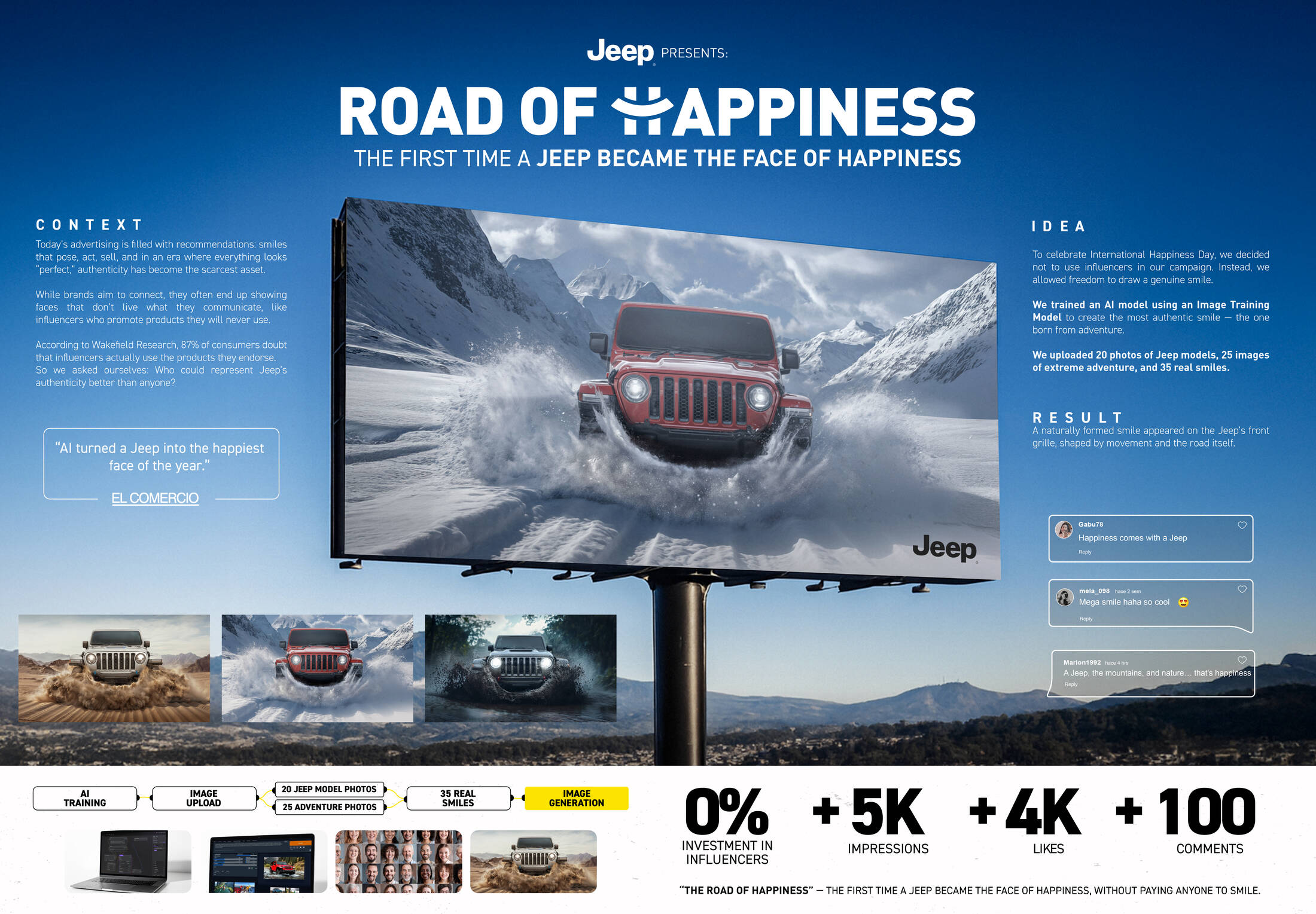 This professional campaign titled 'Road of Happiness' was published in Ecuador in March, 2025. It was created for the brands: Jeep and Jeep Ecuador, by ad agency: Norlop VML Ecuador. This Print medium campaign is related to the Automotive and Personal Transportation industry and contains 5 media assets. It was submitted 6 months ago by Andres Sanchez of Norlop VML.