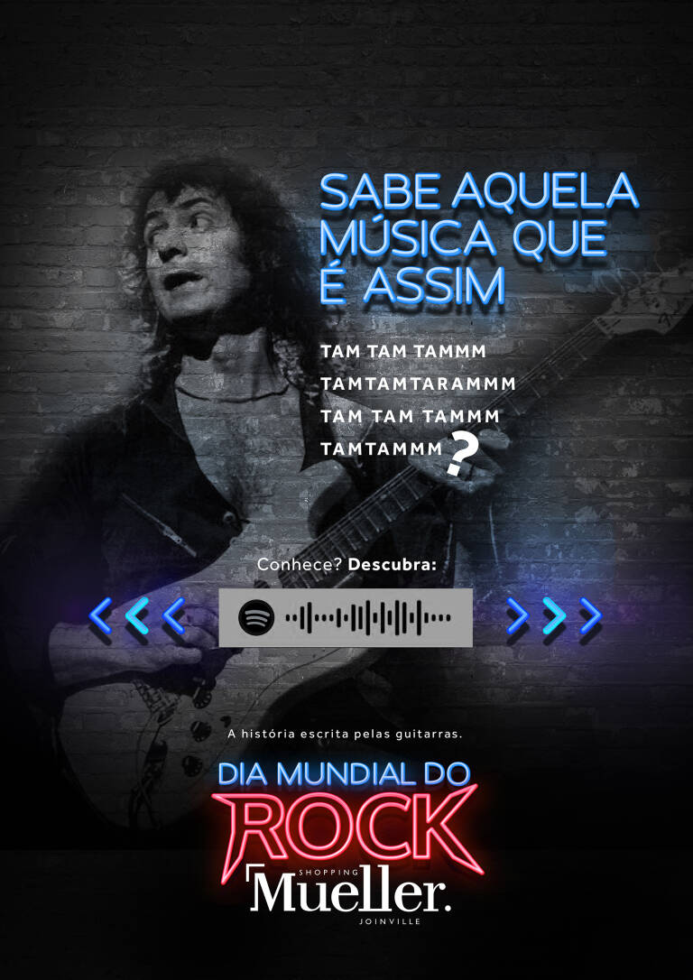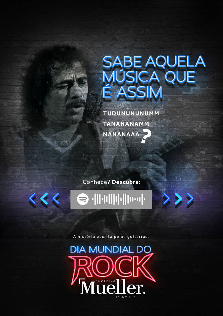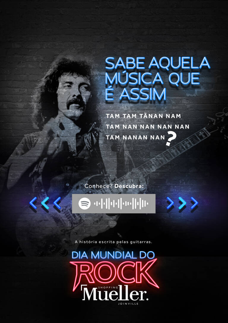 Shopping Mueller set up an exhibition of guitars to celebrate the day of rock. To announce this exhibition, we produced a series of ads that tell the legacy of rock through guitars. In these, we use the sound that people usually do when asked about songs with famous guitar solos.