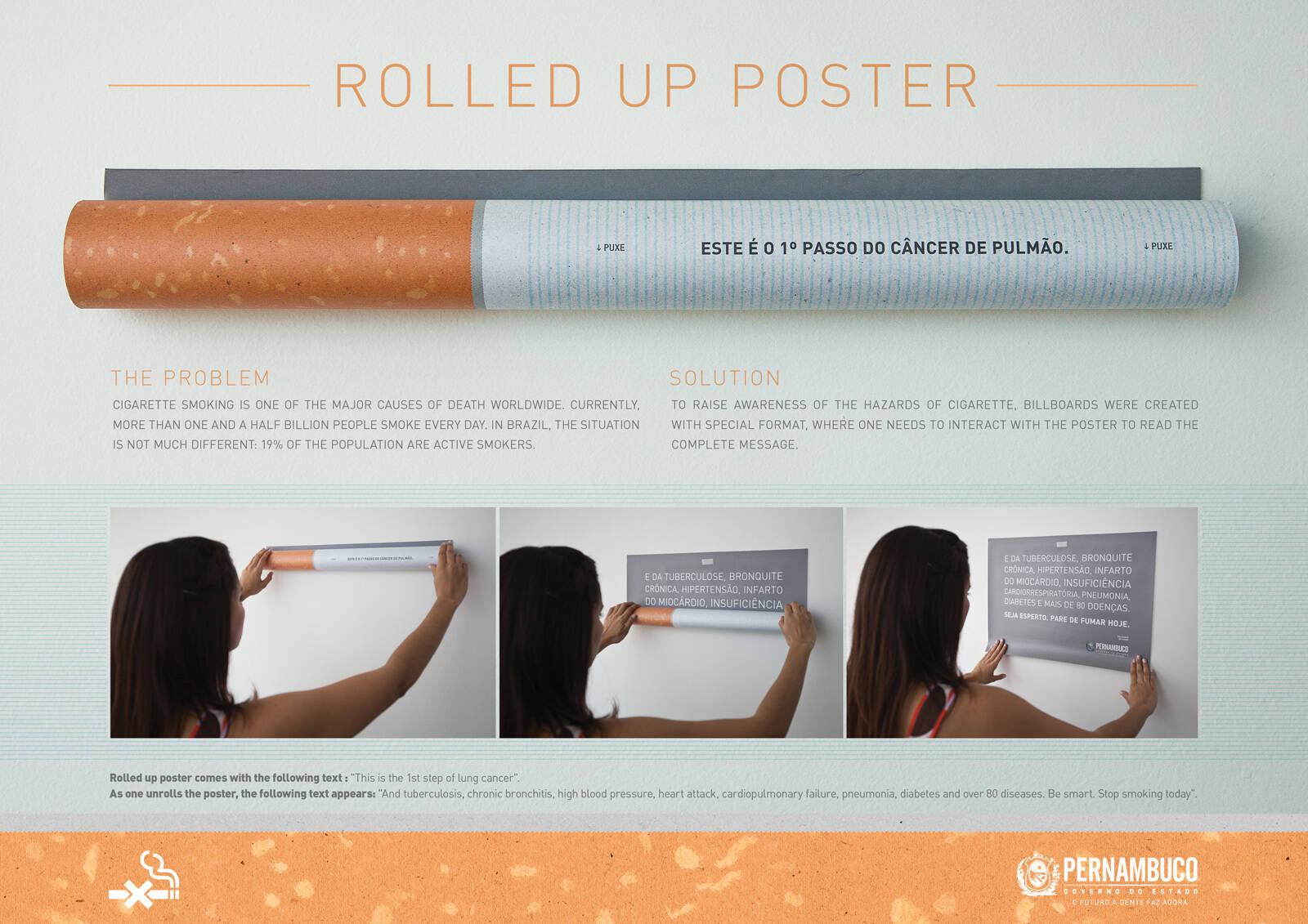 This professional campaign titled 'Rolled up poster' was published in Brazil in August, 2012. It was created for the brand: Secretaria de Saúde de Pernambuco, by ad agency: Blackninja. This OOH Outdoor medium campaign is related to the Public Interest industry and contains 1 media asset. It was submitted over 13 years ago.