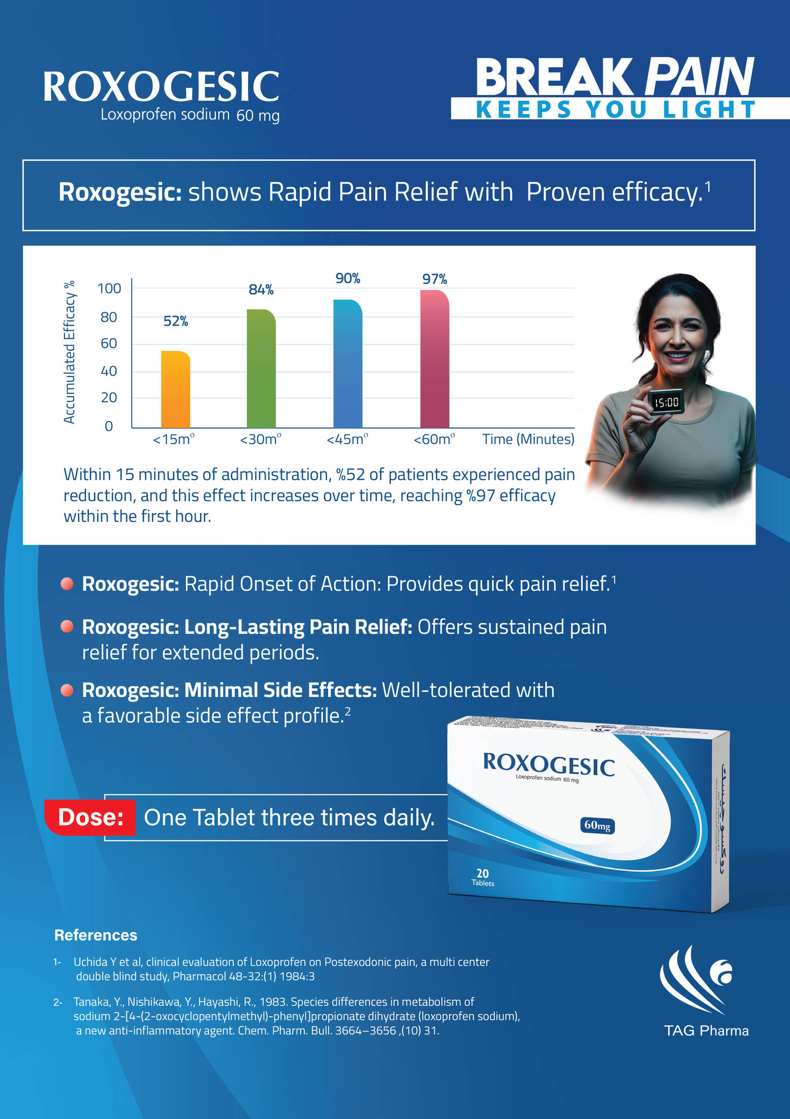 This professional campaign titled 'ROXOGESIC Loxoprofen Sodium 60 mg' was published in Egypt, Saudi Arabia, and United Arab Emirates in March, 2025. It was created for the brand: tag pharma, by ad agency: Brain Shine. This Design, Digital, and Print media campaign is related to the Health, Industrial, and Pharmaceutical industries and contains 7 media assets. It was submitted 8 days ago by Darkdesigner: Peter Nasser Aziz of AWA Food Solutions.