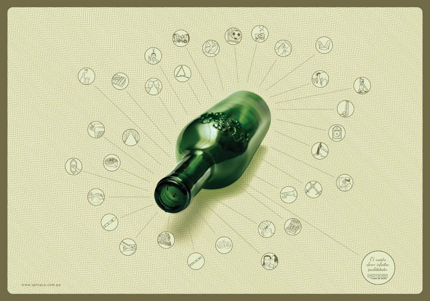 This professional campaign titled 'Rubber band, Balloon, Bottle' was published in Peru in May, 2010. It was created for the brand: Spinaca, by ad agency: Ogilvy. This Print medium campaign is related to the Professional Services industry and contains 3 media assets. It was submitted over 15 years ago.