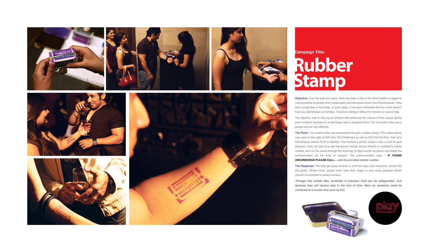 This professional campaign titled 'Rubber stamp' was published in India in April, 2009. It was created for the brand: Play, by ad agency: RMG Connect. This Ambient medium campaign is related to the Recreation, Leisure industry and contains 1 media asset. It was submitted over 16 years ago.