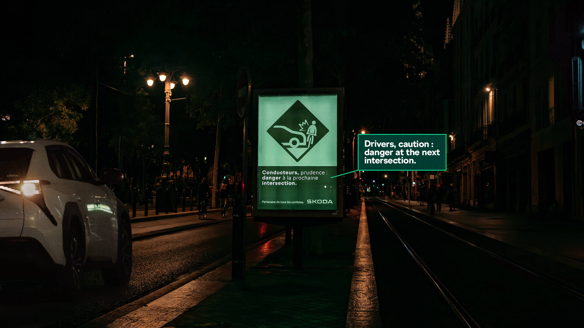 Škoda presents: Safety Billboards, advertising panels transformed into road signs. The Business Intelligence teams at DDB Paris collected all available data on the most accident-prone areas for cyclists. These include: dangerous intersections, pothole locations, high-risk crossroads, and collision zones between cyclists and other road users.