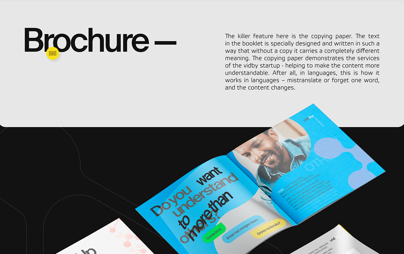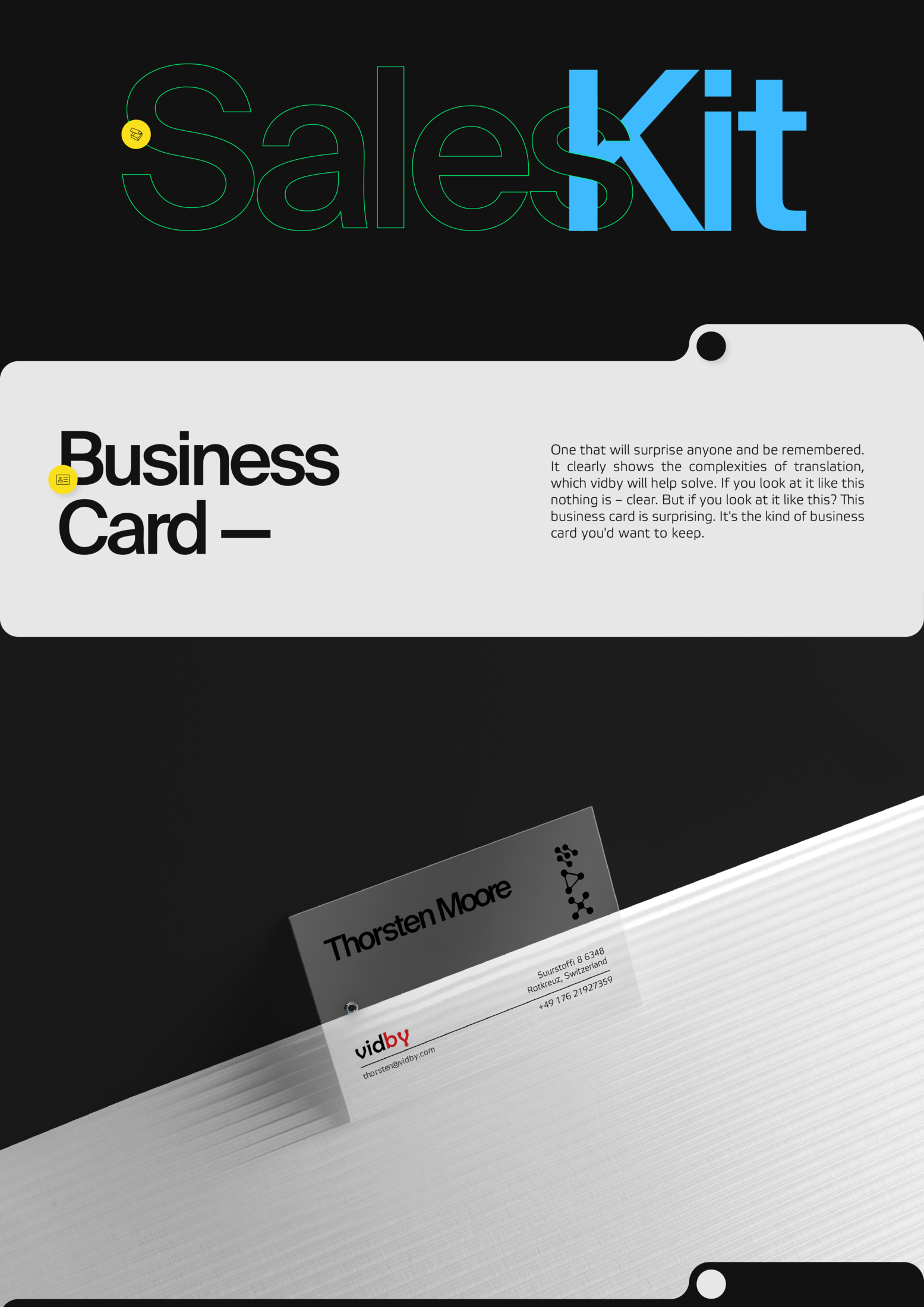 This professional campaign titled 'Sales Kit Development.' was published in Switzerland in October, 2023. It was created for the brand: vidby, by ad agency: Brain Tank. This Design and Print media campaign is related to the Electronics, Technology and Other industries and contains 12 media assets. It was submitted about 2 years ago by Brain Tank.