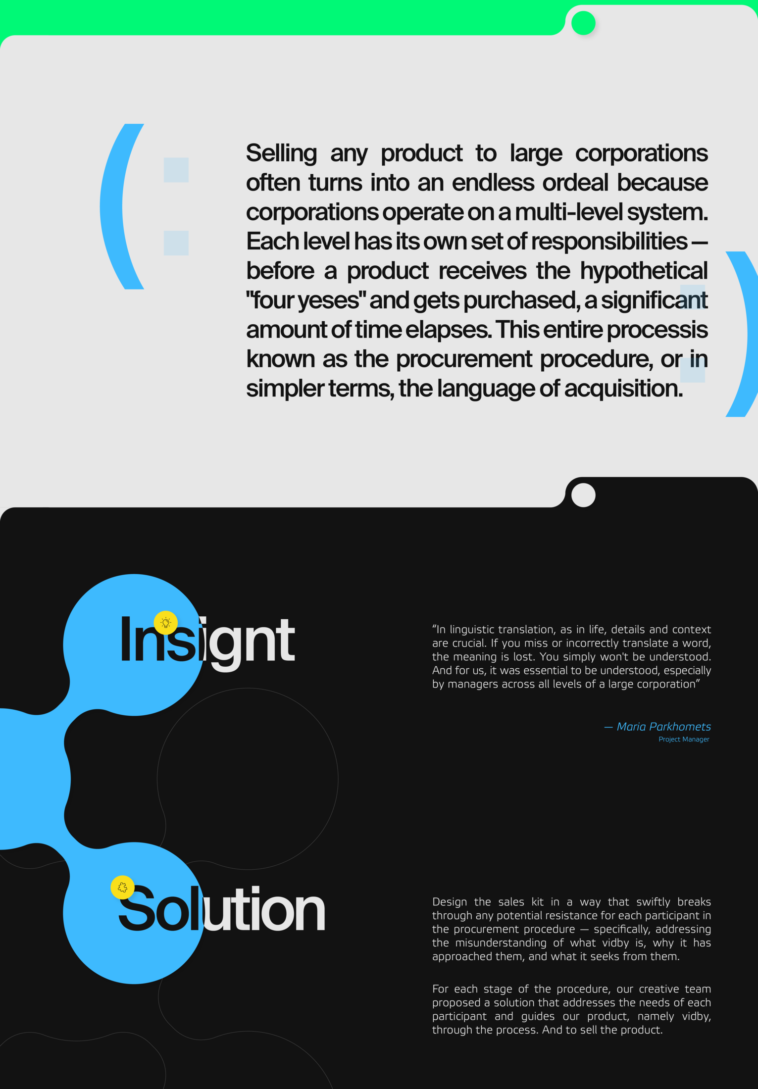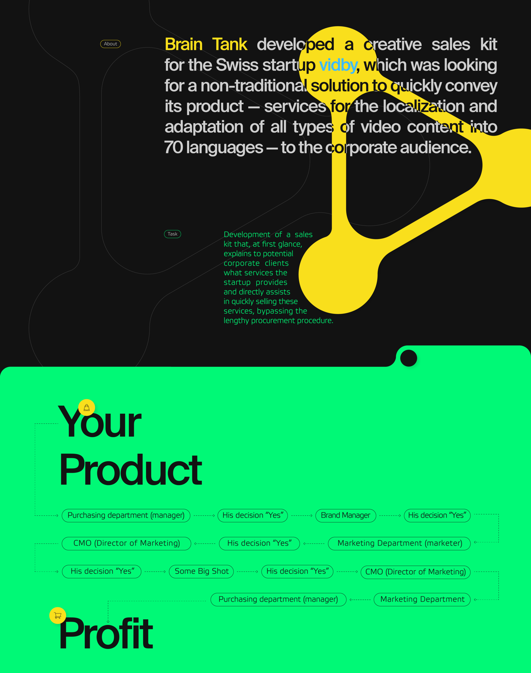Brain Tank developed a creative sales kit for the Swiss startup vidby, which was looking for a non-traditional solution to quickly convey its product — services for the localization and adaptation of all types of video content into 70 languages — to the corporate audience.