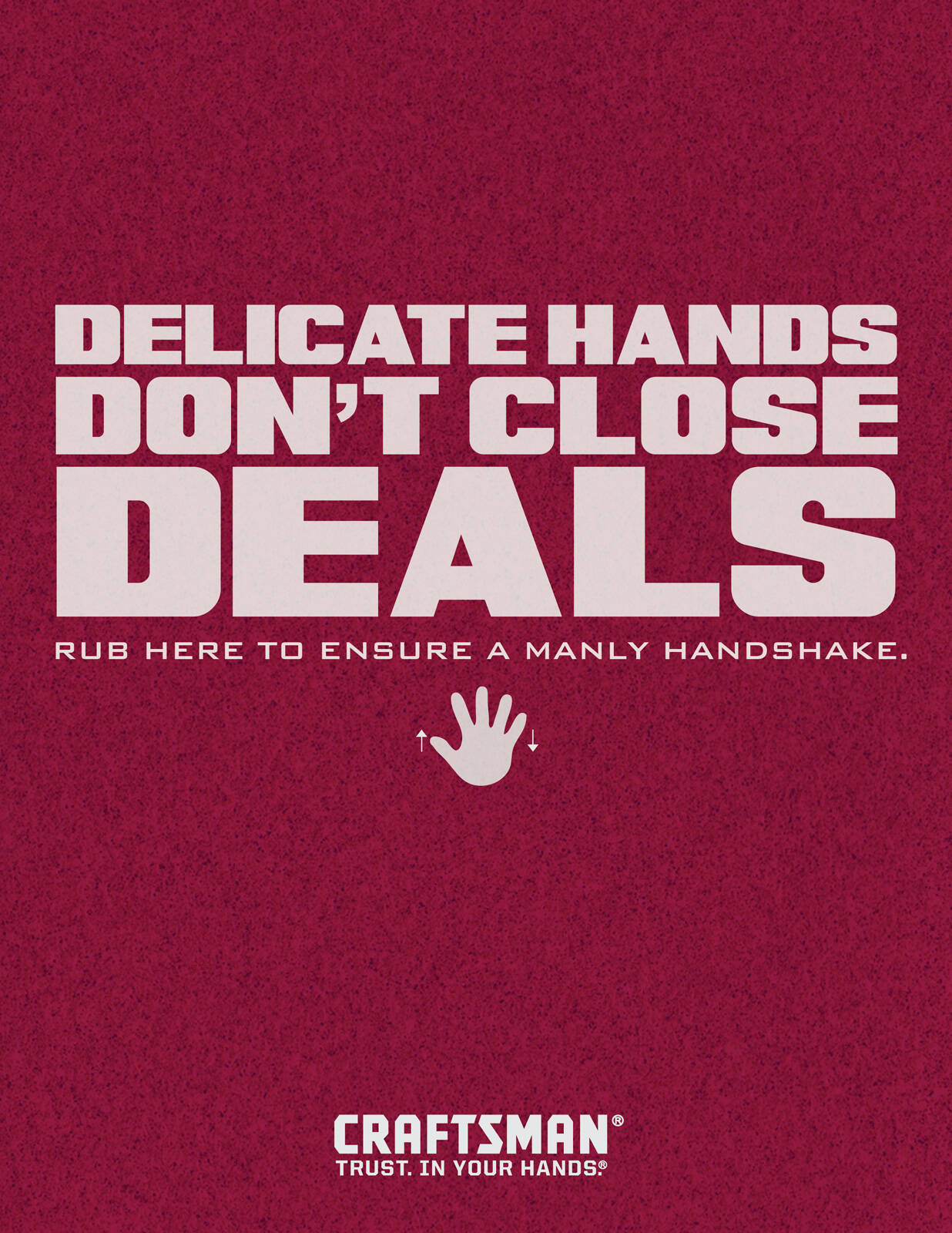 Craftsman have strong hands. These posters, printed on sand paper, invite people to get the hands of a Craftsman by rubbing their hands on it.