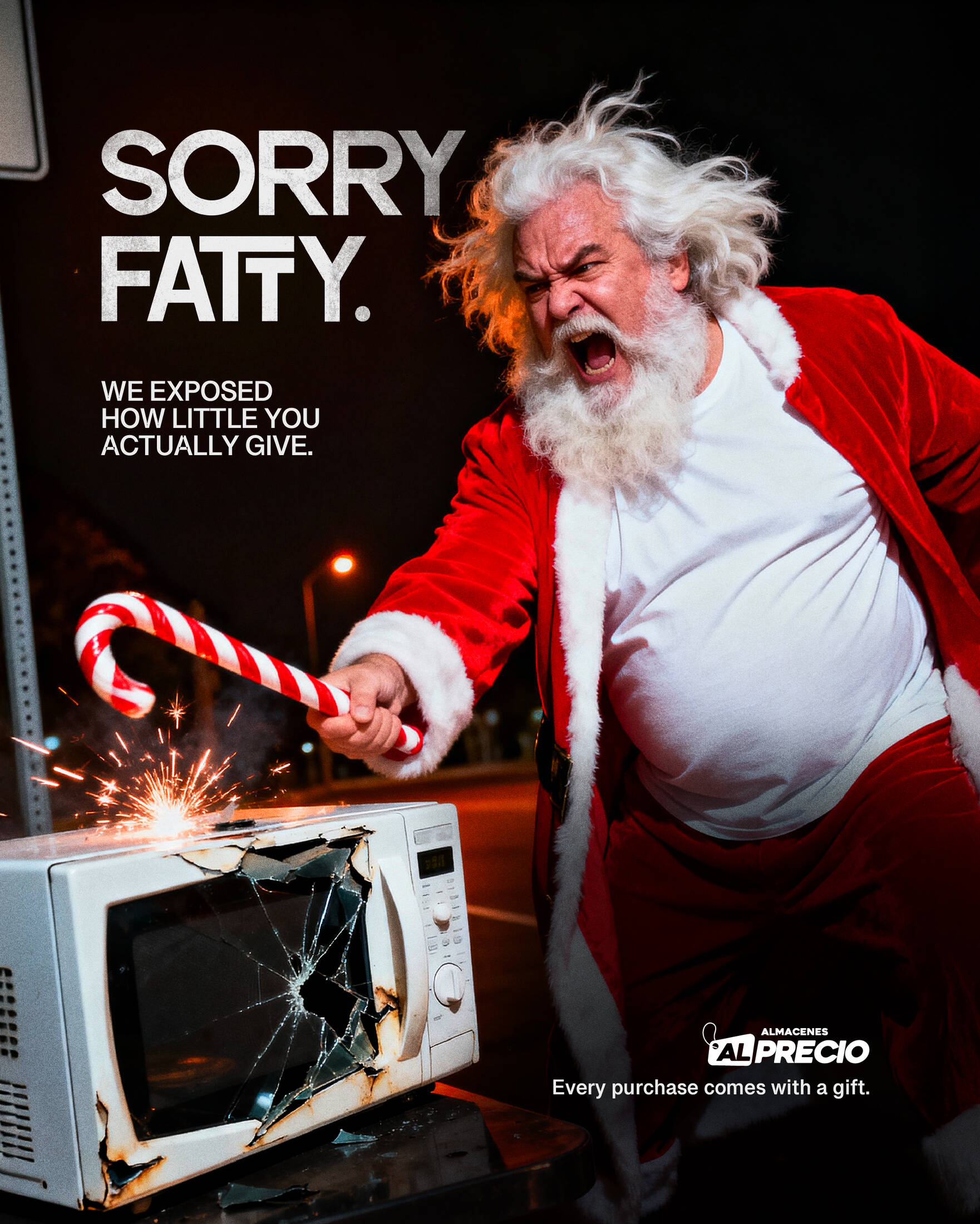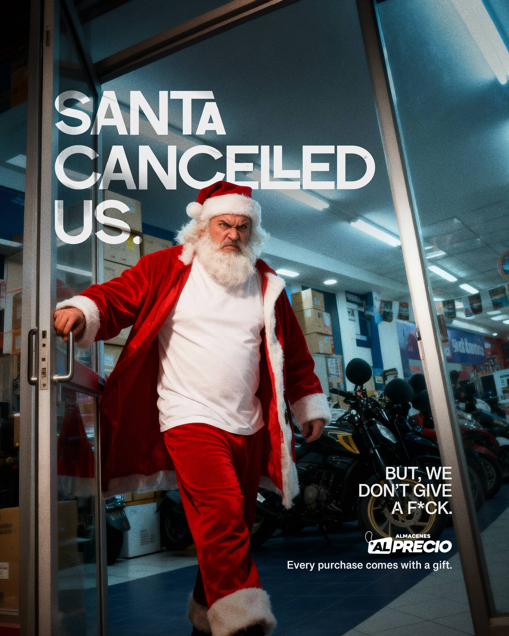 This professional campaign titled 'Santa Hates Us' was published in Ecuador in December, 2025. It was created for the brand: Almacenes Alprecio, by ad agency: La Destilería. This Digital, OOH Outdoor, and Print media campaign is related to the Electronics, Technology and Retail Services industries and contains 4 media assets. It was submitted about 1 hour ago by Creative Director: Cesar Sepulveda of La Destileria.